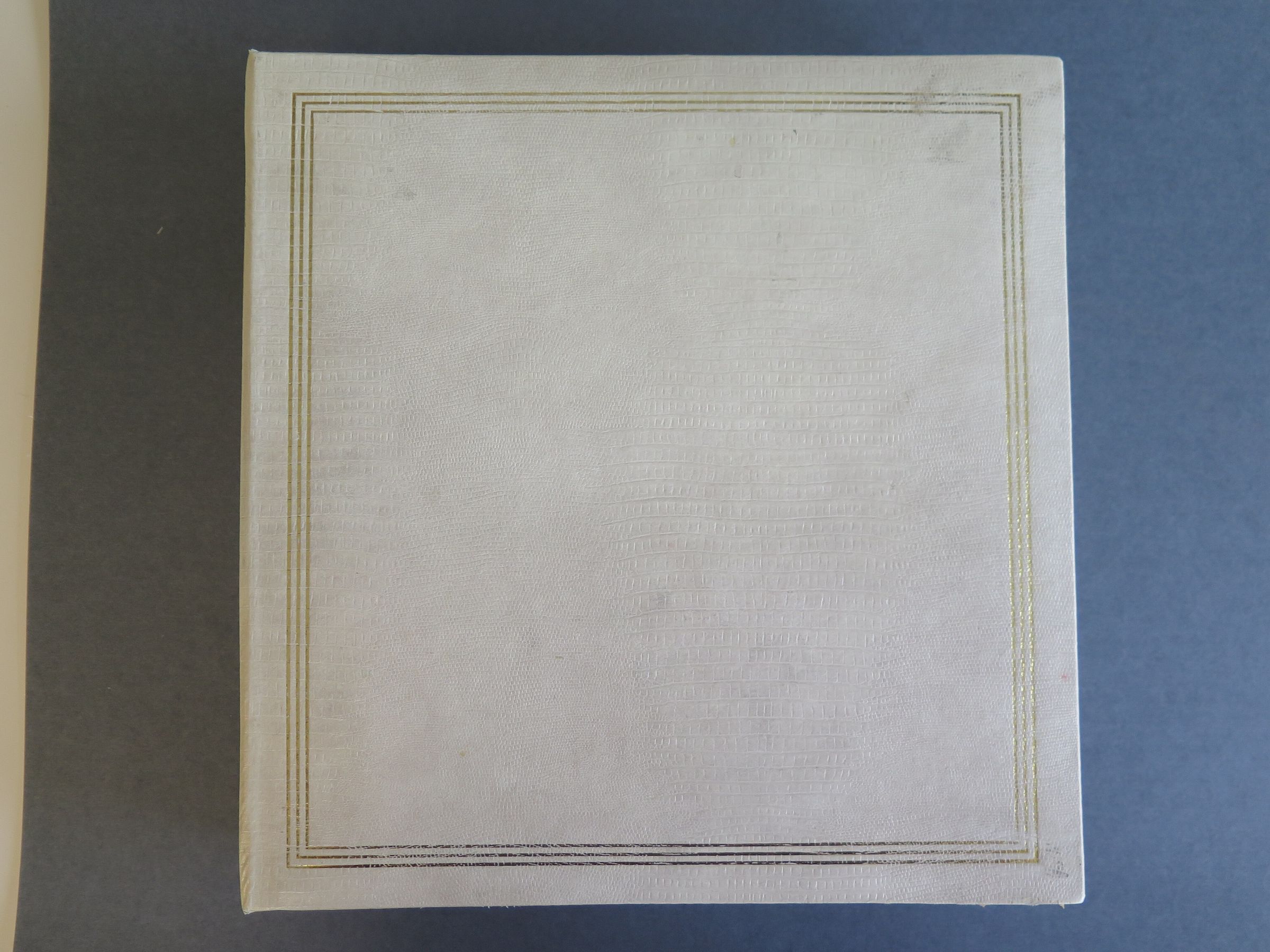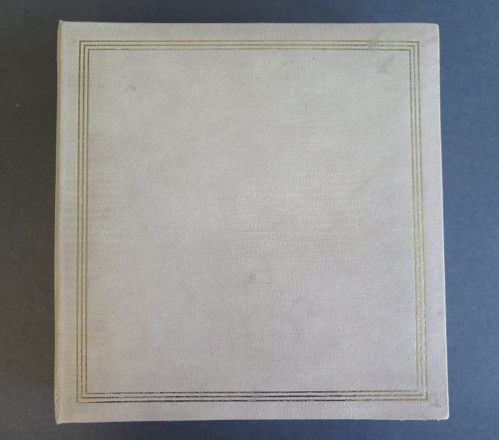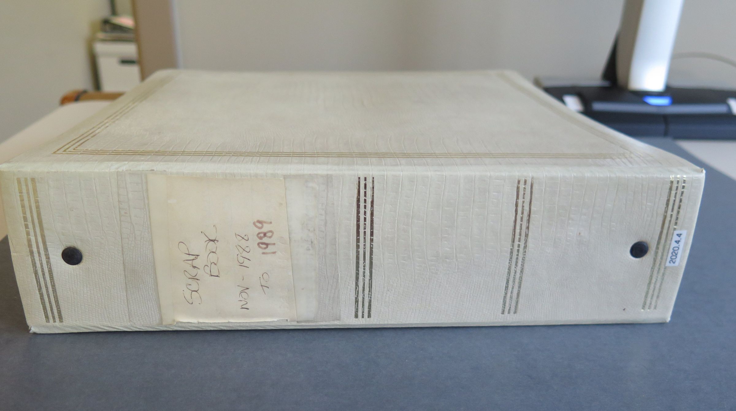 Scrapbook, white with gold trim, various newspaper clippings and pictures.