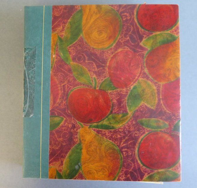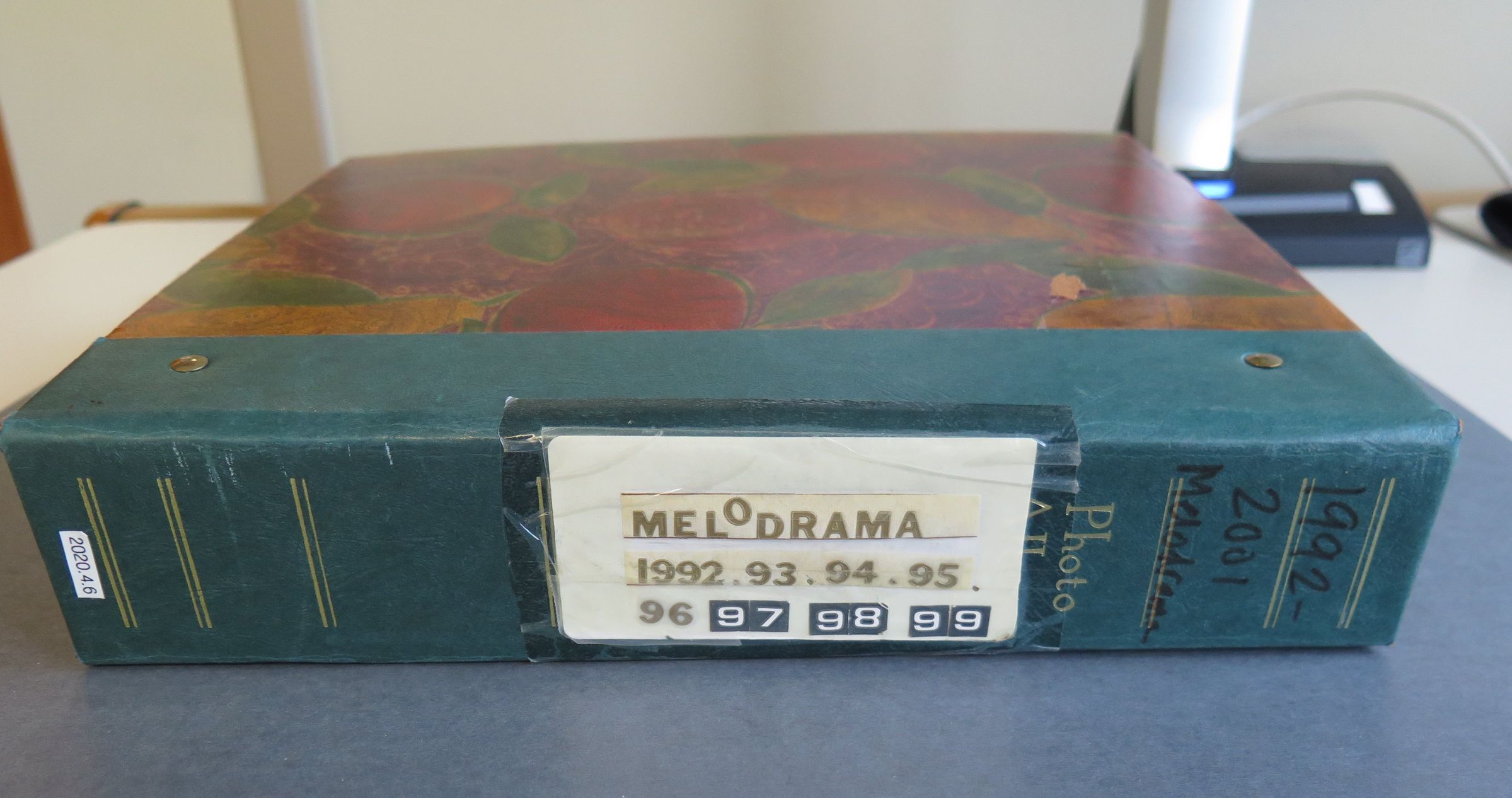 Scrapbook with red, green, orange fruit cover, green border on side. Titled Melodrama