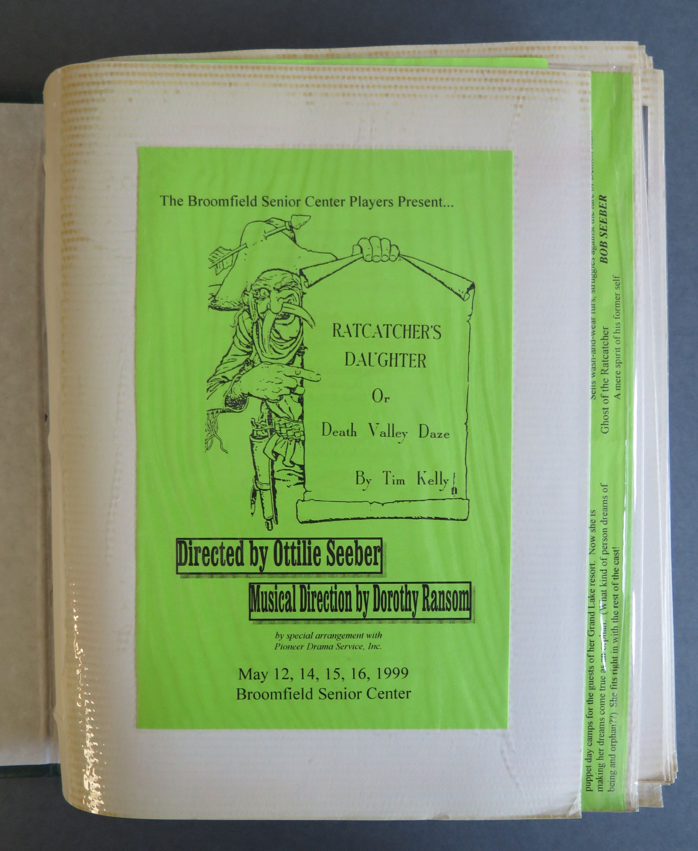 The Broomfield Senior Center Players, Ratcatcher's Daugher or Death Valley Daze, by Tim Kelly, Ottlie Seeber, Dorothy Ranson, May 1999, Phanton of the Op'ry, October 1998, article by Terri Chance, No, No, A Million Times NO!, October 1996, Who Threw the Overalls in Mrs. Murphy's Chowder?, Octobr 1995, Rose Marie and Emmet Olson, Dogsbreath Devereaux, the Dastardly Doctor or Nurses! Foiled Again! by Billy St. John, October 1994, The Ballad or Gopher Gap or Sticky Fingers Won't Wash by Tim Kelly, October 1993, The Shame of Tombstone or Dirty Work in the Lucky Cuss by Tim Kelly, October 1992, A Clean Sweep or The More Things Change, the More they Stay the Same, October 2000, The Broonfield Melodrama Star,Lexicon