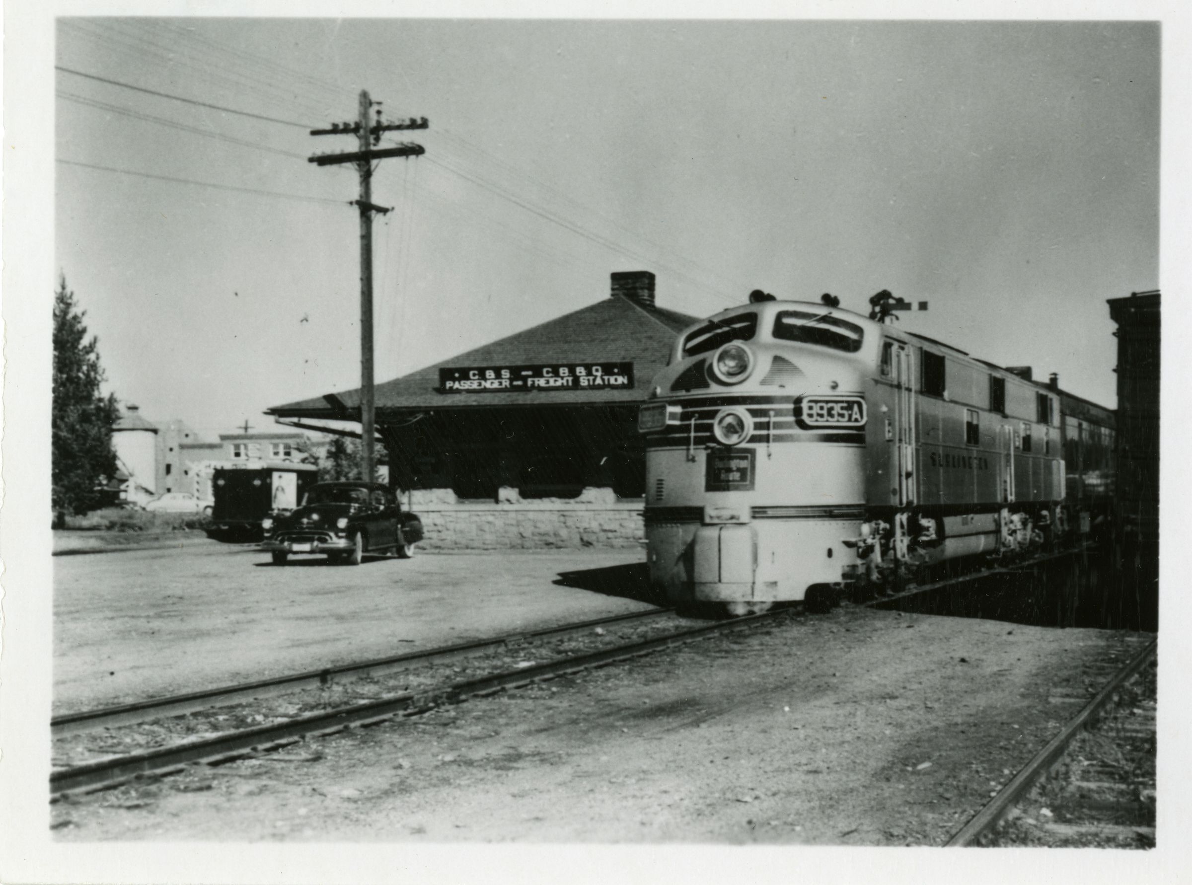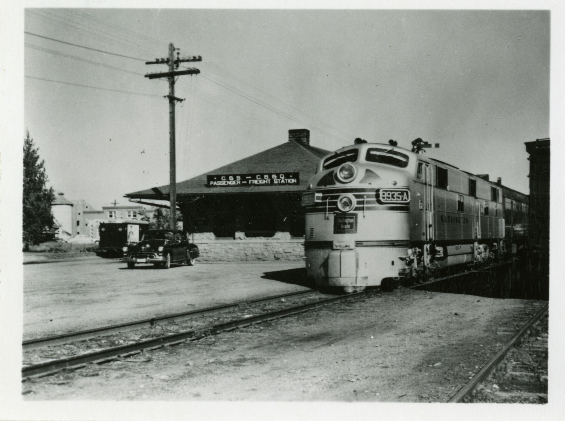 Black and white photograph print of the "Texas Zephyr" train at a station or rail yard, circa 1950s. The print is 3" x 4." The image shows the silver colored diesel locomotive, unit #9935-A, on tracks. A car, telephone pole, and a building with a sign stating, "C.B.S - C.B.B.Q Passenger - Freight Station" are to the train's left. To the right, a train car is visible, cut off at the image's right edge. Some trees and buildings are visible in the background near the left edge of the image.
