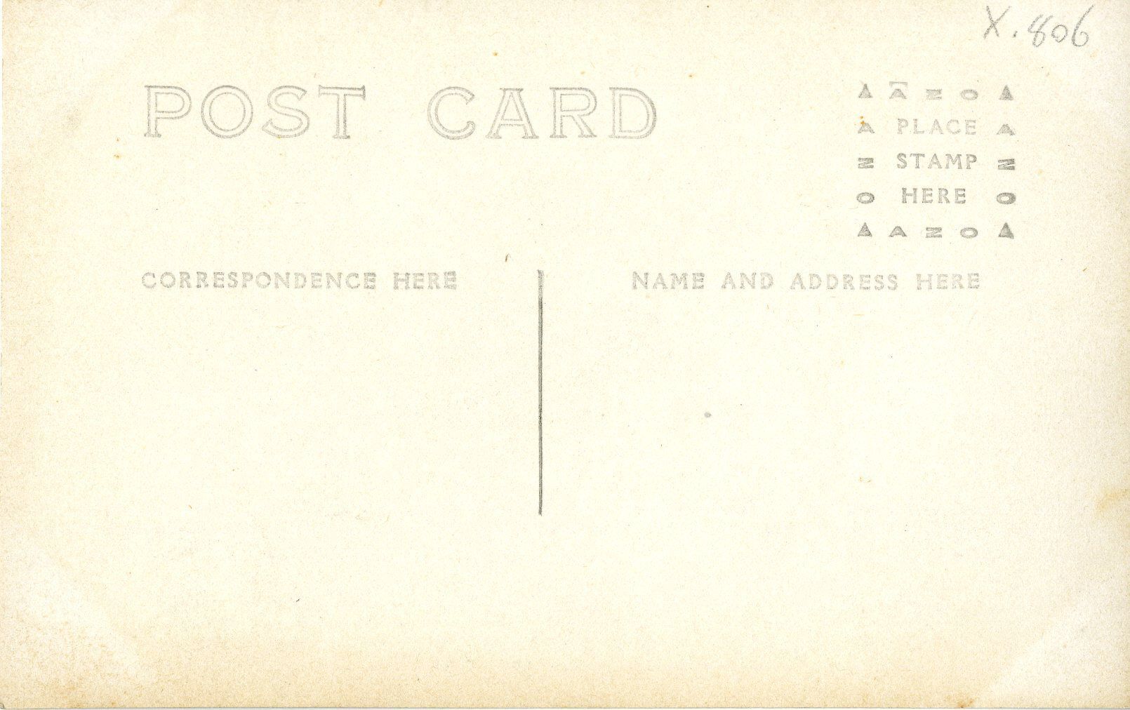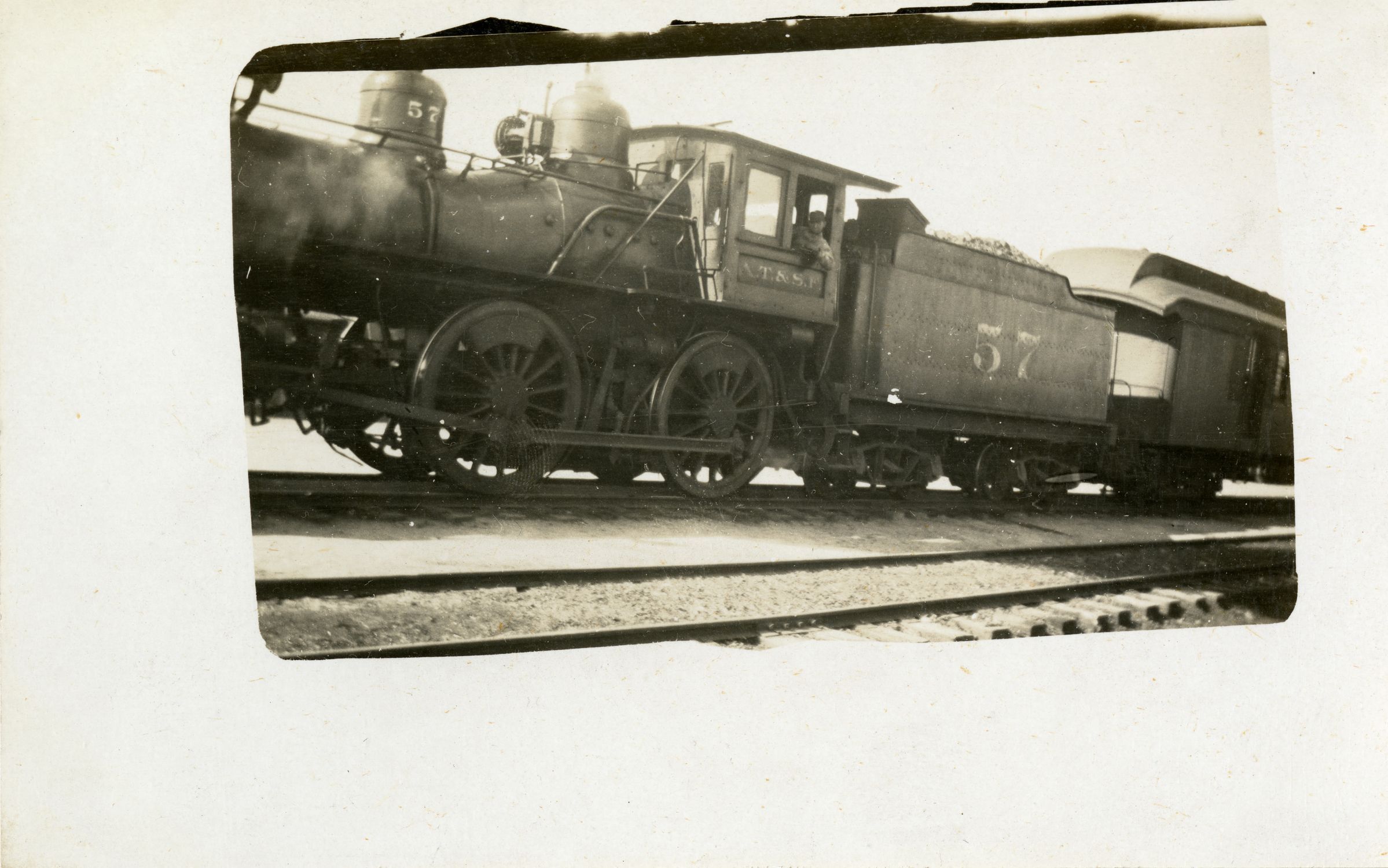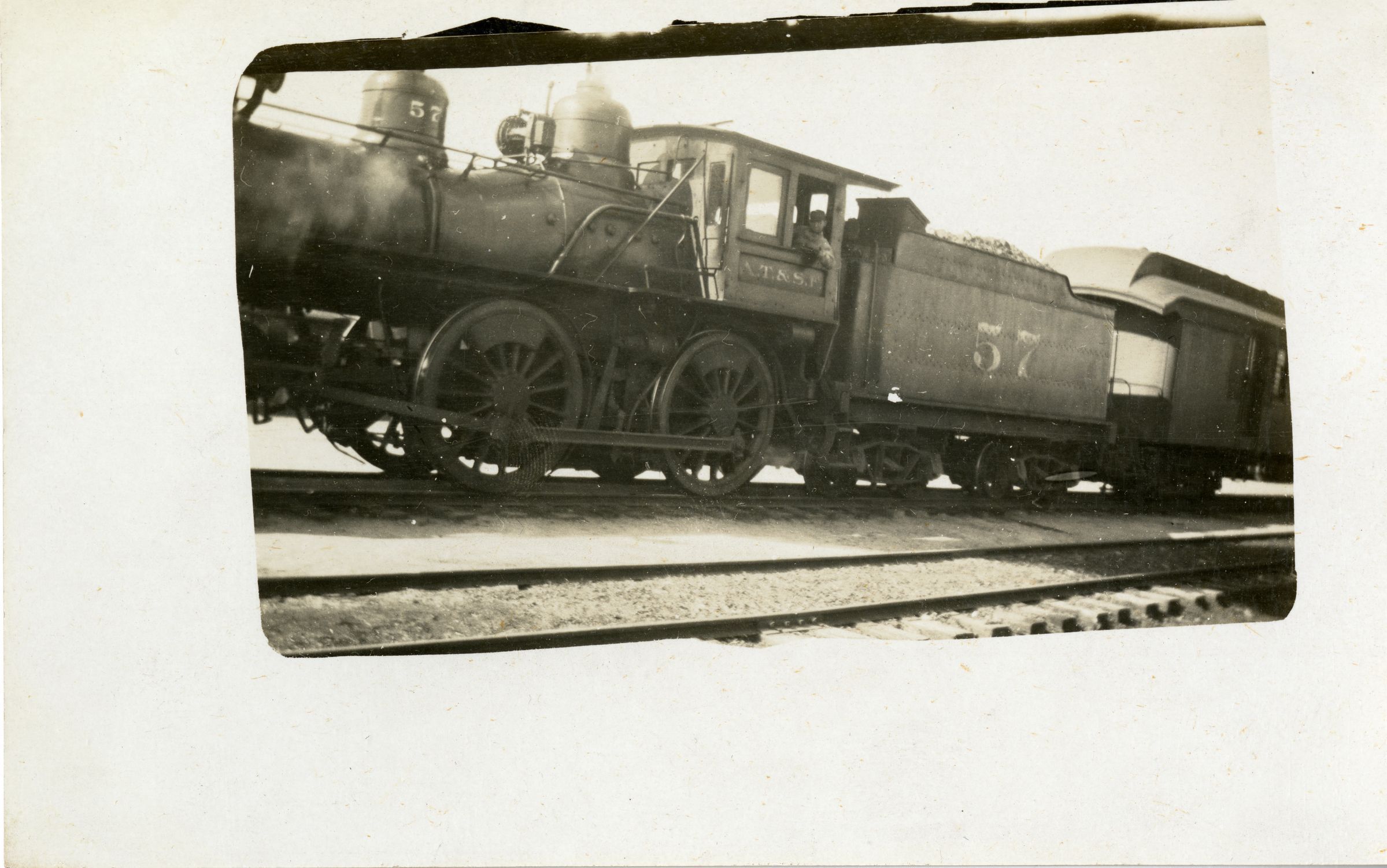 An Azo postcard depicting a steam locomotive and its driving conductor, circa 1904-1918. The postcard is 3.5" x 5.5", with the photographic print at 2.5" x 4". The image has the camera zoomed in somewhat, highlighting the conductor leaning out the locomotive's window. The number "57" is on one of the cars full of rocks or coal, and on the locomotive. The abbreviation "A.T.&.S.F" is lettered just under the locomotive's window, which stands for Atchison, Topeka & Santa Fe, the railroad the train operated with. Another set of train tracks is visible just next to the train, in the foreground. The reverse side has "Post Card" printed at the top, with two sides for writing, labeled "Correspondence Here" and "Name and Address Here." The stamp area in the upper right corner has "Azo" lettering surrounding the box, with triangles pointing up in each corner. The postcard does not have any writing.