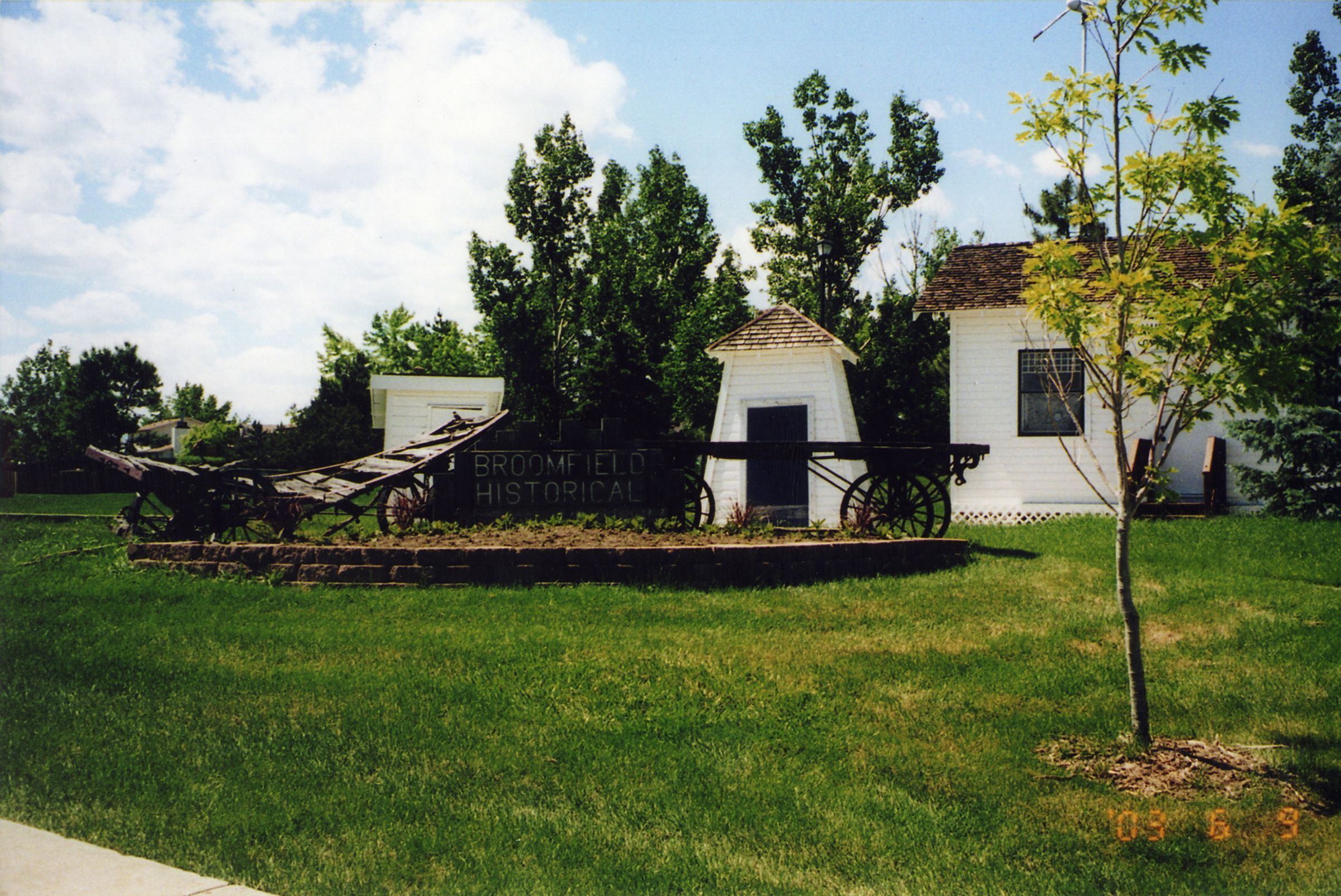 Color photograph print of the "Broomfield Historical Depot Museum" sign by the Broomfield Depot Museum, 2008. The print was made with a newer color process, and is resin coated. The image shows the wooden sign, which says, "Broomfield Historical," with two wooden luggage carts on either side of it. The outhouse, water pump structure, and Crawford Honey House are behind them. Many trees are in the background, with green grass and a small tree to the right in the foreground. The Broomfield Depot Museum was also known as the Broomfield Historical Depot Museum.