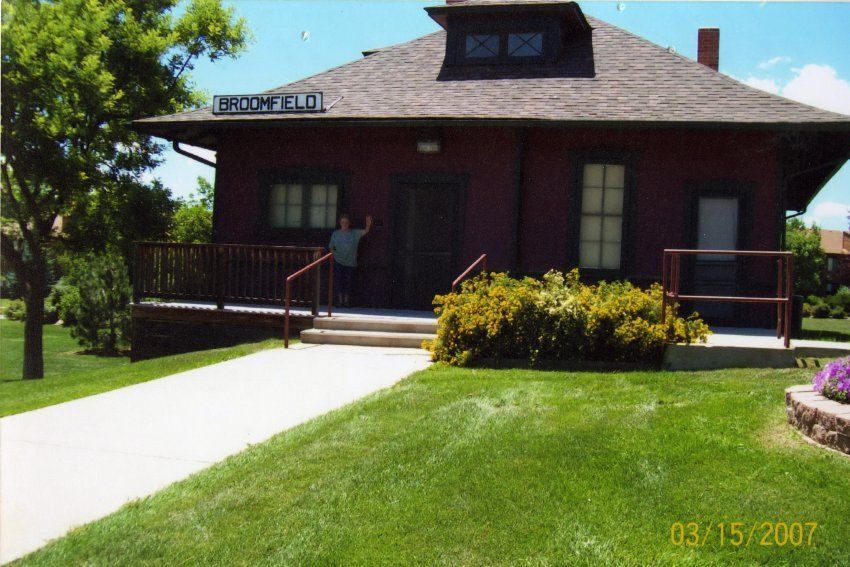 Color photograph print of the front of the Broomfield Depot Museum with then Museum Director Peggy Atkinson posing by the door, 2007. The print was made using a newer color process, and is resin coated. A tree is visible to the left, with a bush of flowers immediately in front of the depot. Broomfield sign is clearly visible on the left side of the roof.