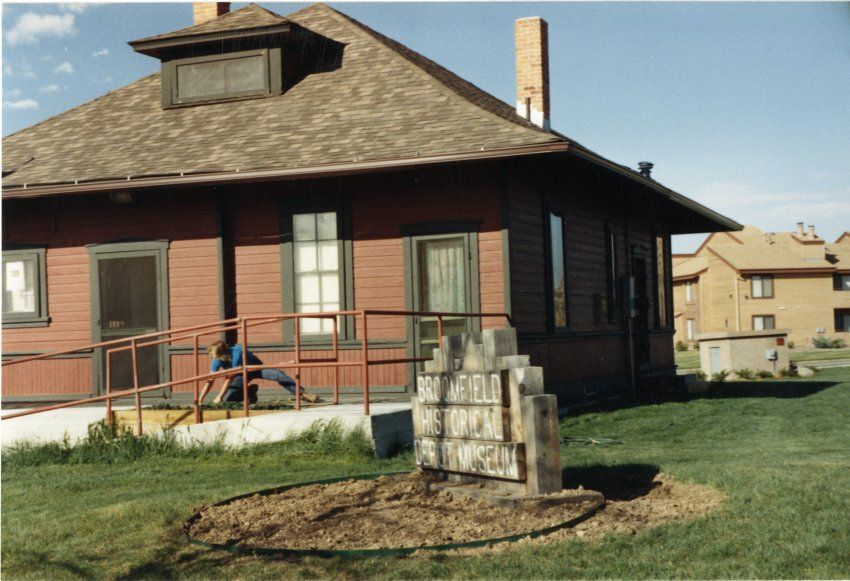Color photograph print of the Broomfield Depot Museum with a man doing planting work on the front porch, 1988. The print was made with a newer color process, resin coated. The "Broomfield Historical Depot Museum" sign is visible in the center of the image, with an unplanted garden area in front of it. Green grass is visible all around the museum, with apartment buildings in the background to the right. A man wearing a blue shirt and jeans can be seen knealing down on his knee, planting on the depot's front porch.Collection