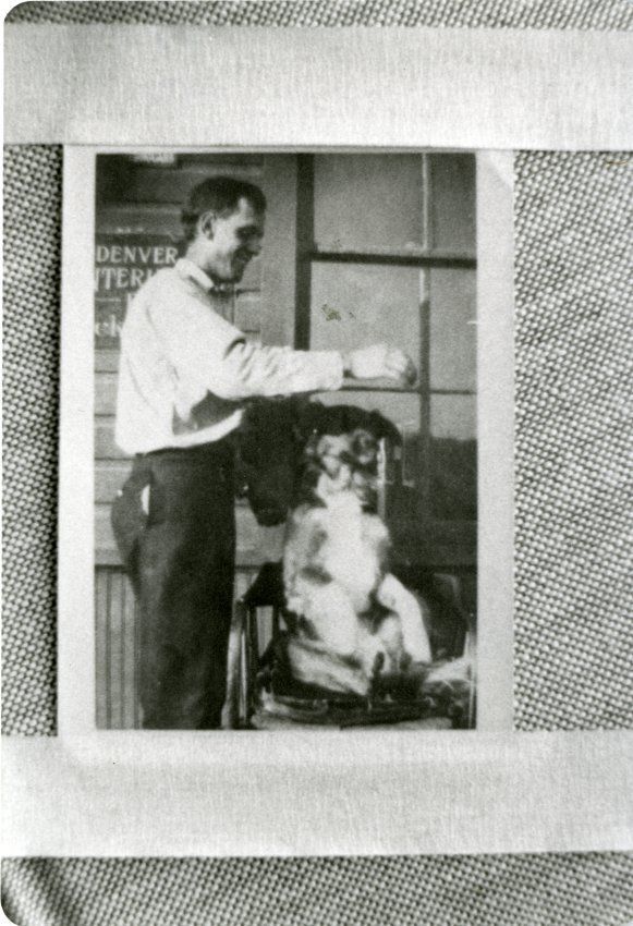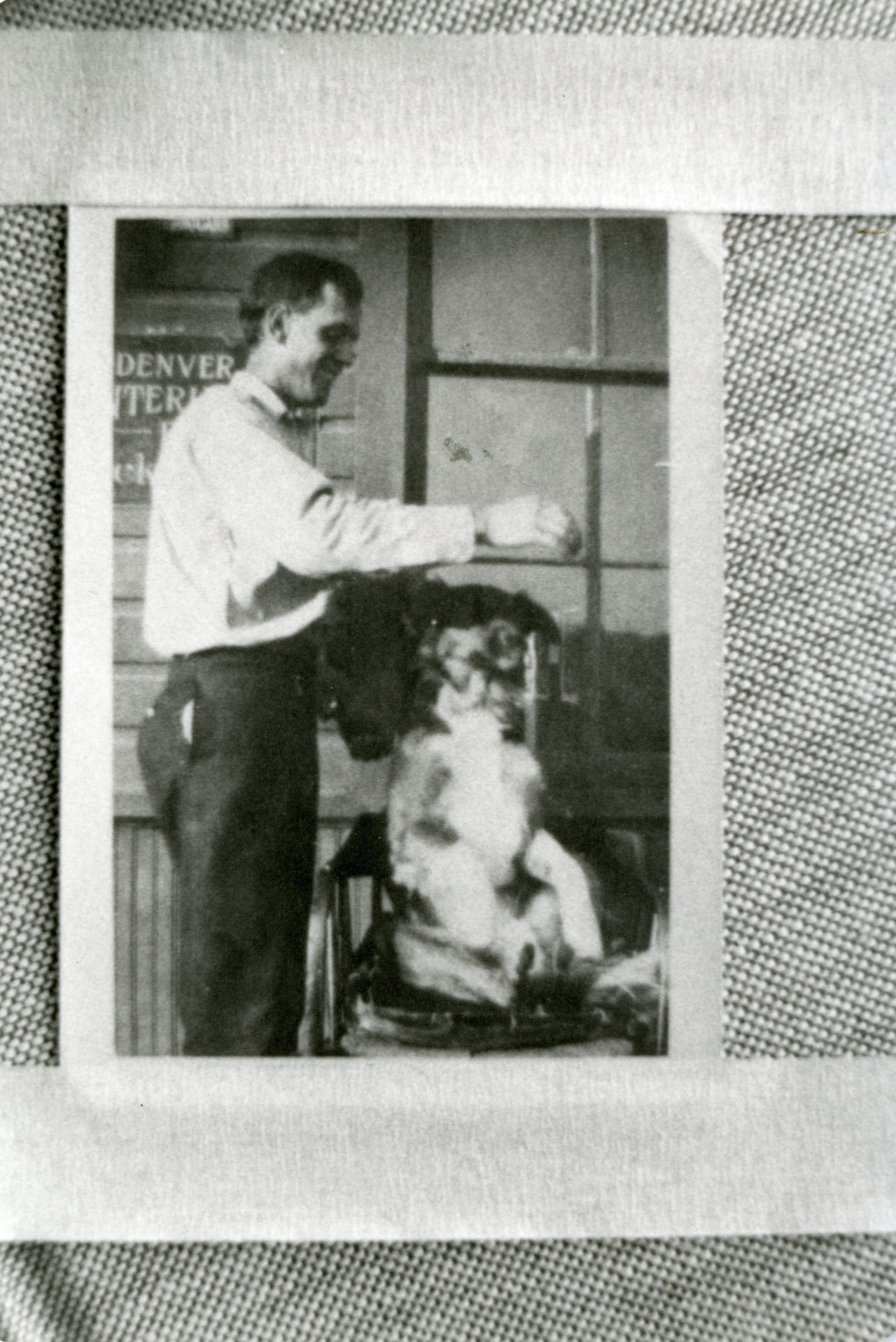 The image shows Vaughan on the left holding out his hand, possibly holding a dog treat. Brownie is sitting upright in a wooden chair in front of a window, looking up to Vaughan's hand. A sign on the wall of the depot behind them states "Denver Interurban R.R.", partially obscured. The reverse side of one print has an inscription in blue ink that says "Neg. #4". The other print has an inscription on its reverse side in black ink that says, "Richard Vaughan (agent) and 'Brownie' at depot 1920."Collection