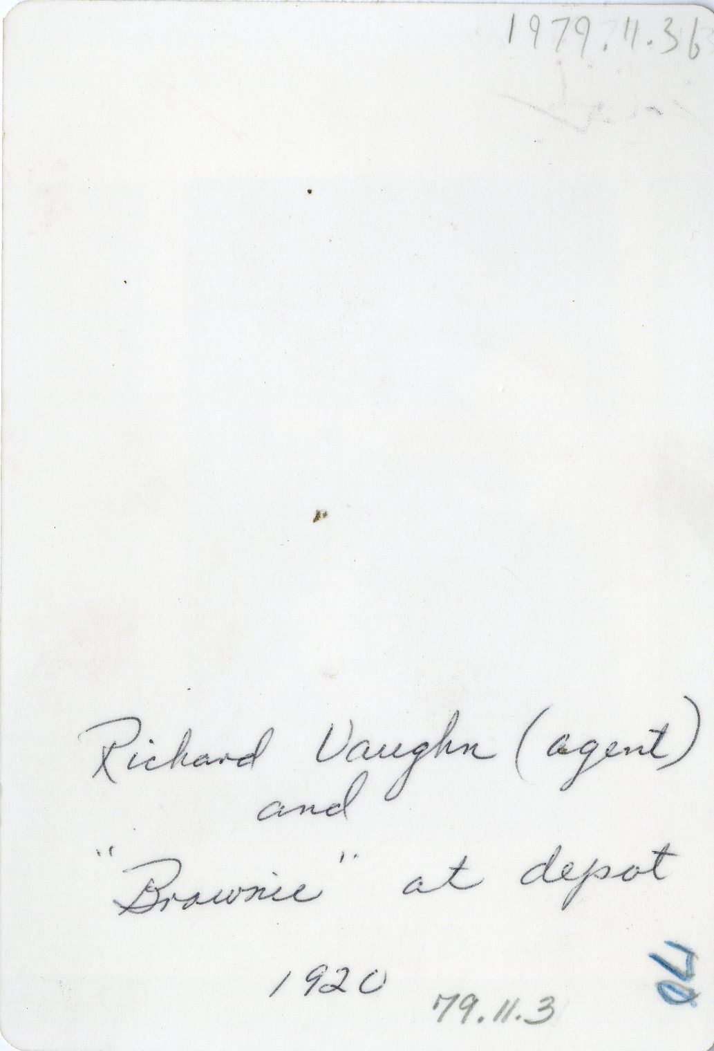 Both photographs, along with photos 1979.11.4-5, were found together in Broomfield Depot Museum collections in photo files, sleeves labeled "Brownie, Broomfield Depot." They were originally donated to the museum in 1979 by the Vaughn family; Richard Vaughn was the Broomfield station agent in the 1920s and 1930s. 1979.11.1-2 and .6-8 have not yet been accounted for in collections.