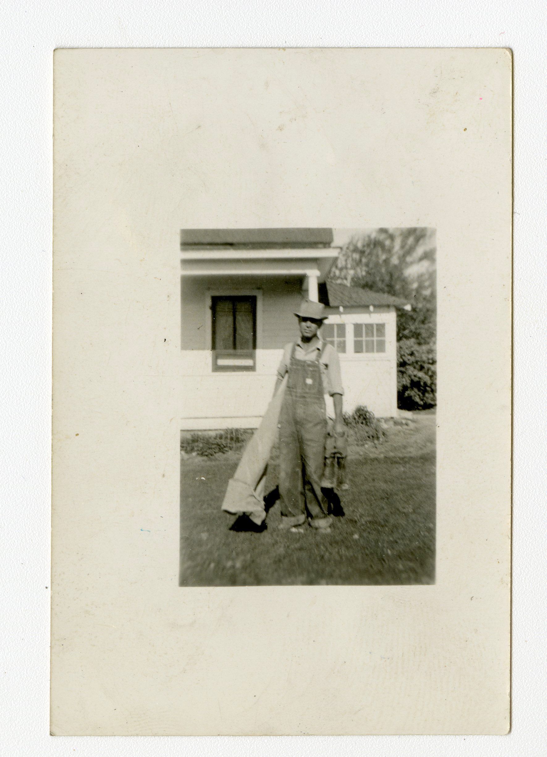 A small, black and white photograph of a man. The photograph was taken outside likely in front of the Brunner Farmhouse. The man is wearing a long-sleeved shirt, overalls, and a hat. He is identified as Lester C Brunner. He is carrying a pair of boots in his left hand and is holding a large cylindrical object in his right arm.