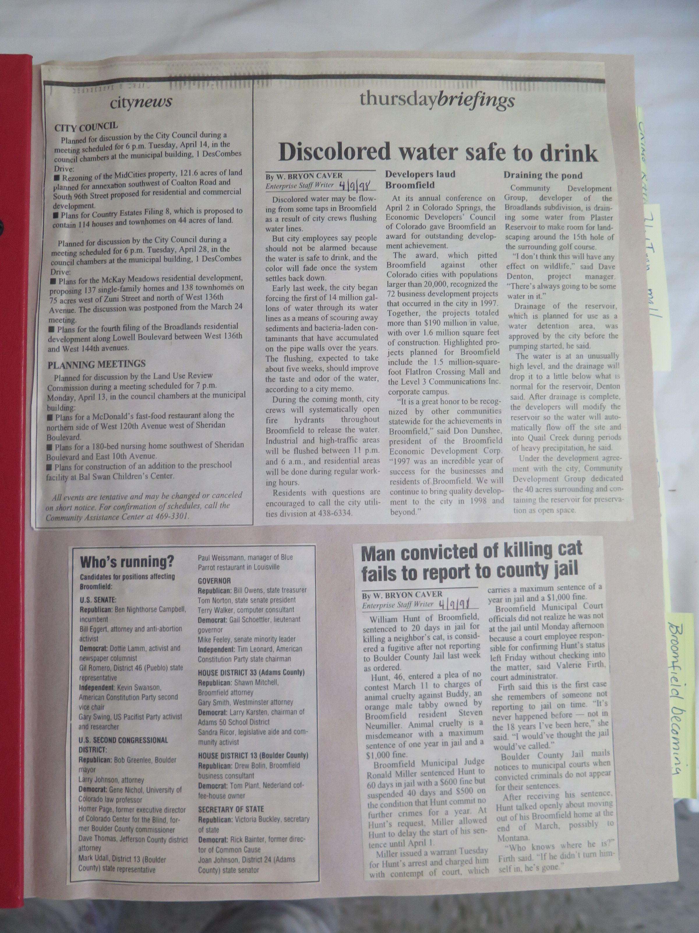 Scrapbook of Broomfield newspaper articles from Nov 1997- April 1998