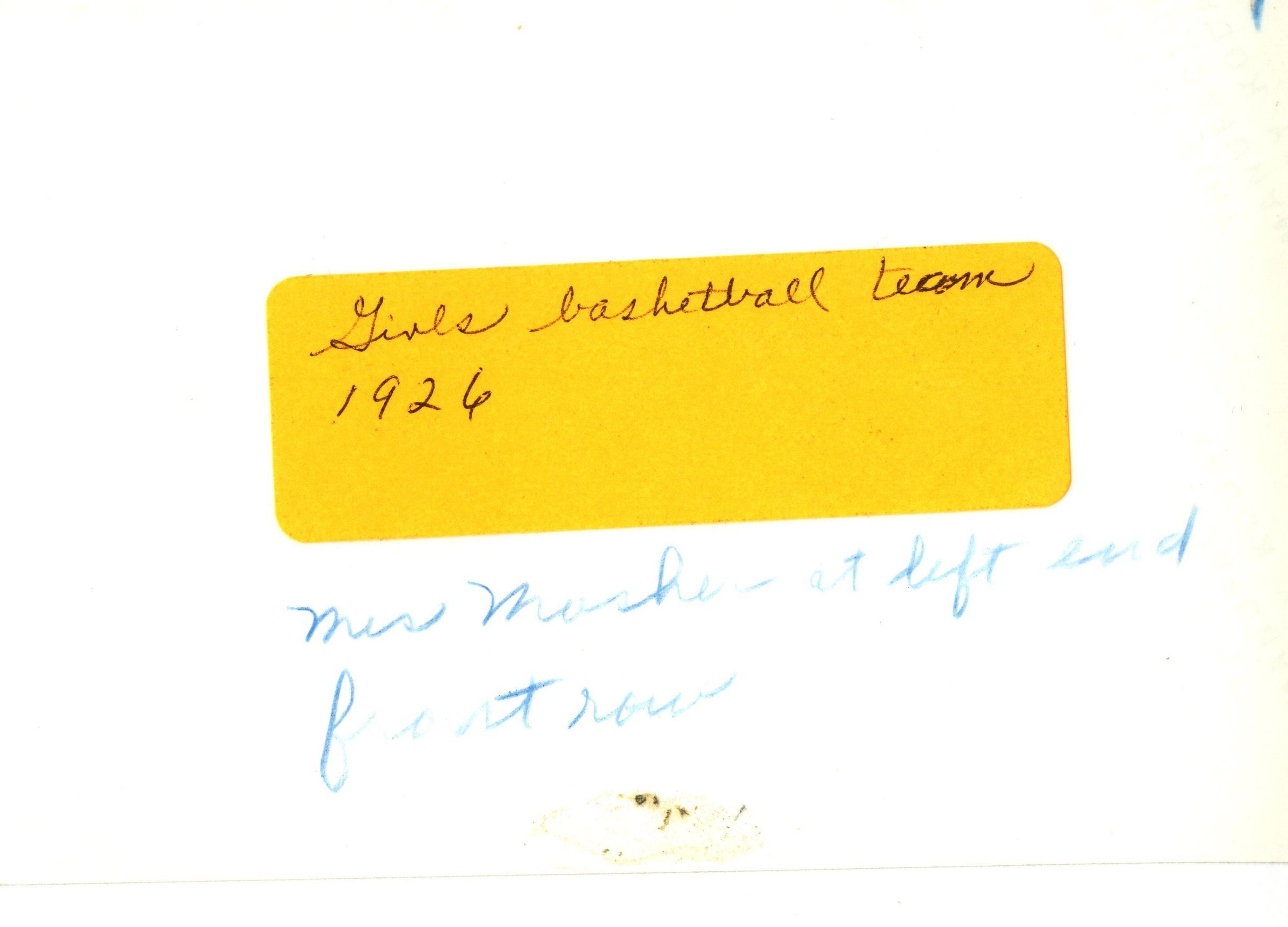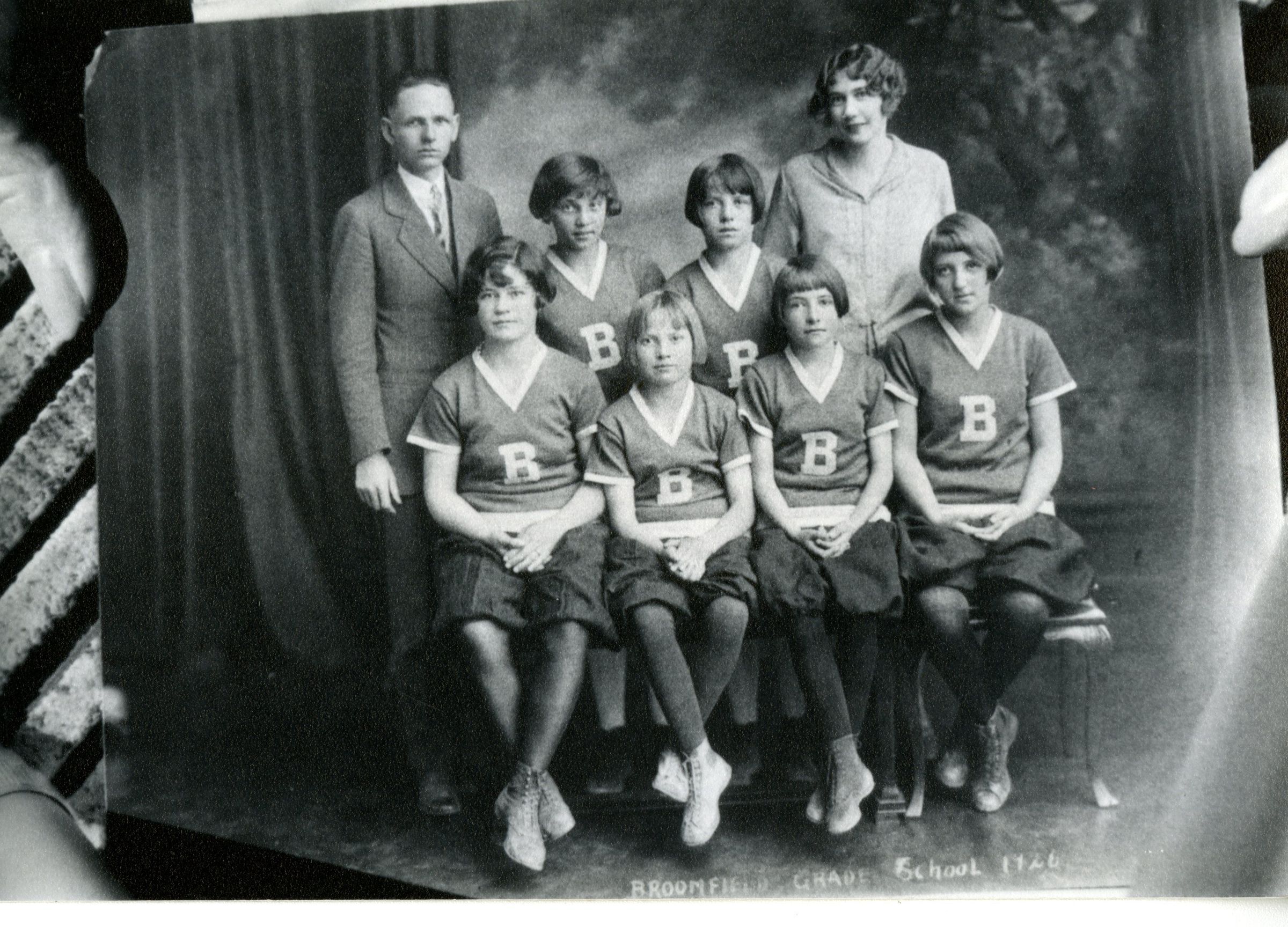 Broomfielfd Grade School Girls basketball team 1926 - Mrs. Katherine Mosher appears front left. Duplicate of ph.2 Negative on file.