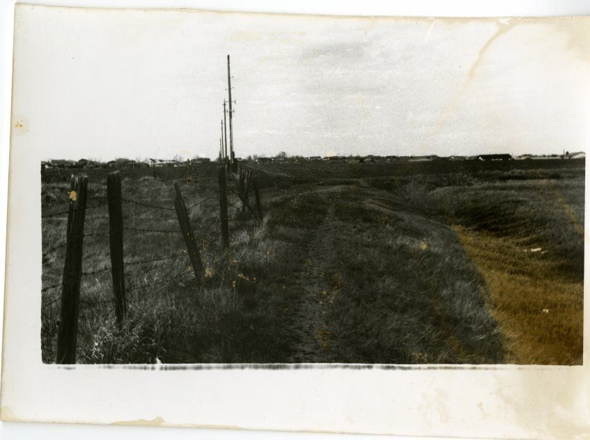 Black and white photograph print of the site of a Denver, Utah and Pacific Railroad (DU&P) grade, circa 1975. The grade was apparently near the land for Brunner Farm; DU&P operated in Broomfield in the 1880s. The print is 4.5" x 7", resin coated. The image depicts a field of grass, with a wired fence and telephone poles seen on the left edge lined up toward the camera. A slight dip can be seen in the grass on the right, possibly indicating the grade. Several houses can be seen in the distant background.