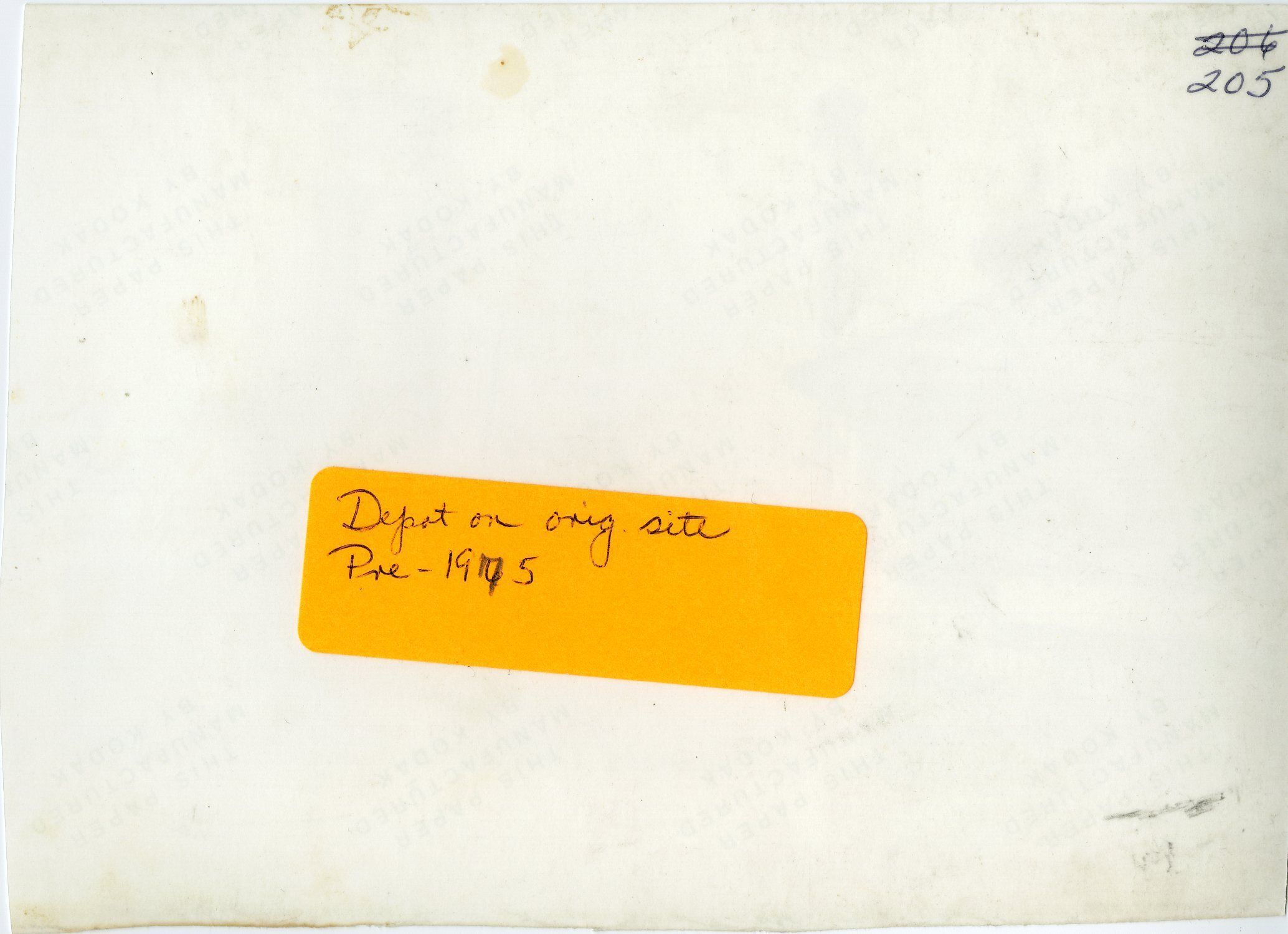 The reverse side has an orange address label with the inscription, in ink, "Depot on orig site Pre 1975." The photo numbering was also crossed out and replaced. It used to be "206," but was changed to "205."Photograph Details