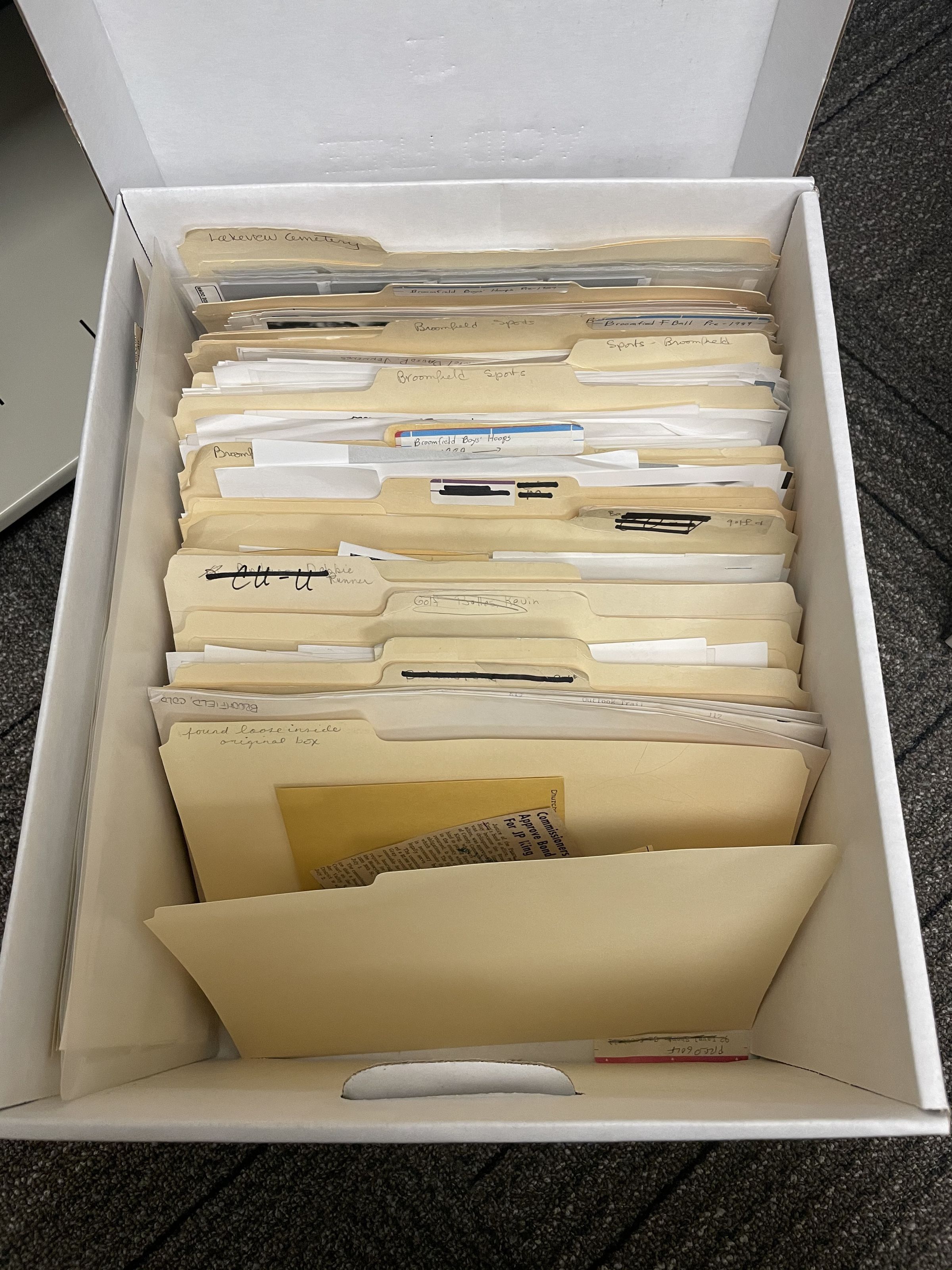 Collection of clippings from the Daily Camera pertaining to Broomfield. Two bankers boxes of various records, including MANY original photo negatives, printed photos, newsclippings, and copy used to make newspaper.Lexicon
