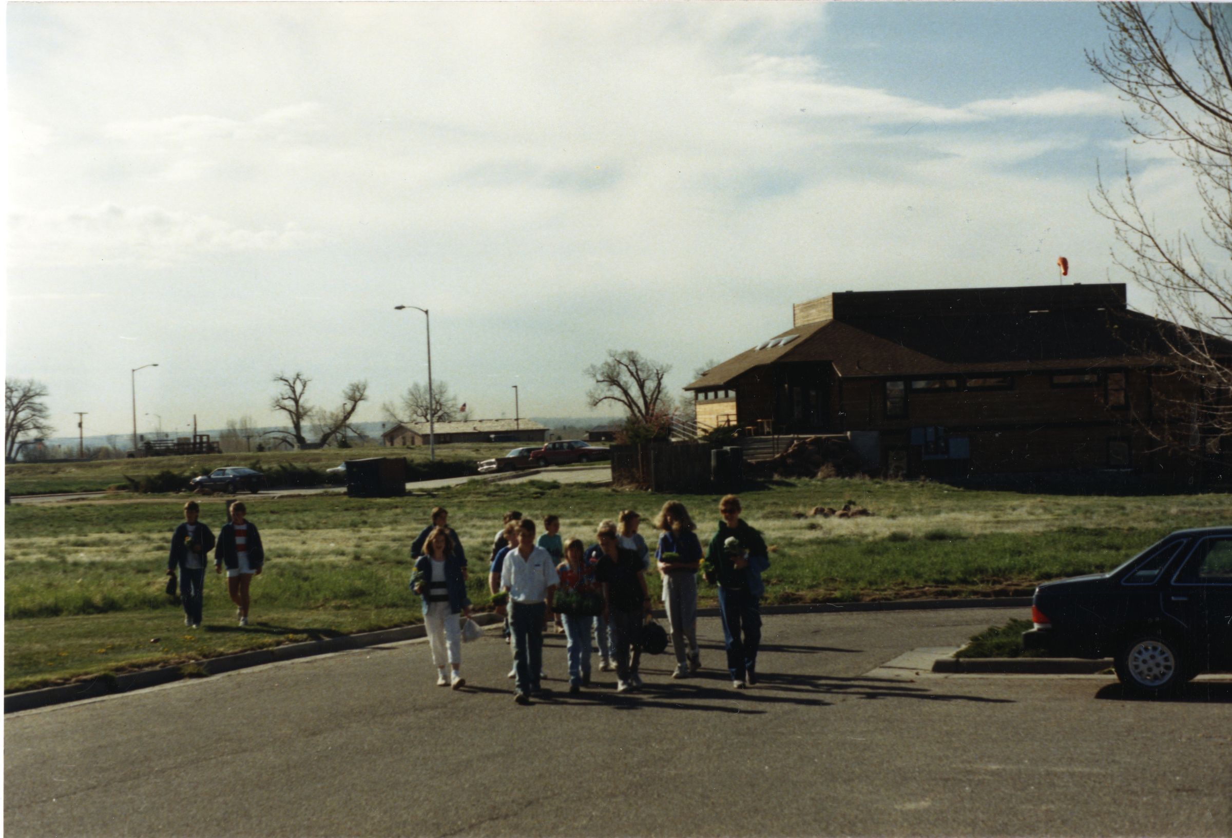 Color photograph print of volunteers walking to the Broomfield Depot Museum from the parking lot to start planting flowers, 1988. The print is a newer color process on Kodak photo paper, resin coated. The image shows fourteen people total, including adults and kids. The back part of a blue, darker colored compact car is visible in a parking spot to the right. An open field of grass and shrubs are seen behind the lot. A large house-like building is located in the field to the right, with leafless trees, street lights, and other buildings in the background.
