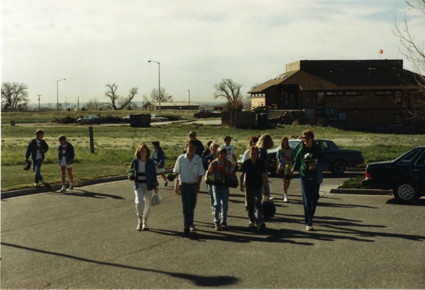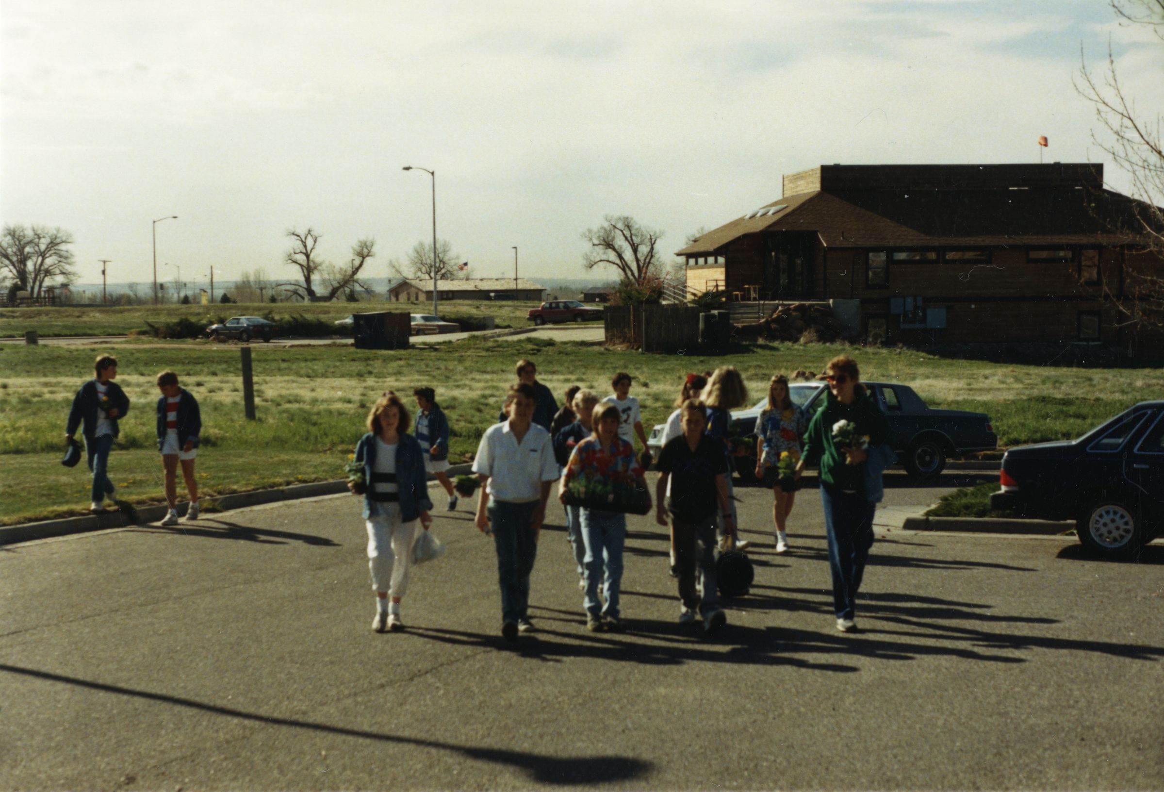 Color photograph print of volunteers walking to the Broomfield Depot Museum from the parking lot to start planting flowers, 1988. The print was made with a newer color process on Kodak photo paper, resin coated. The image shows fifteen volunteers, adults and kids included, all in the parking lot area. The back part of a compact car is visible to the right in a parking spot. Another car is seen driving behind the volunteers. An open field with grass and shrubs is behind the parking lot, with a large house-like building to the right. Leafless trees, street lights, and other buildings can be seen scattered in the background.
