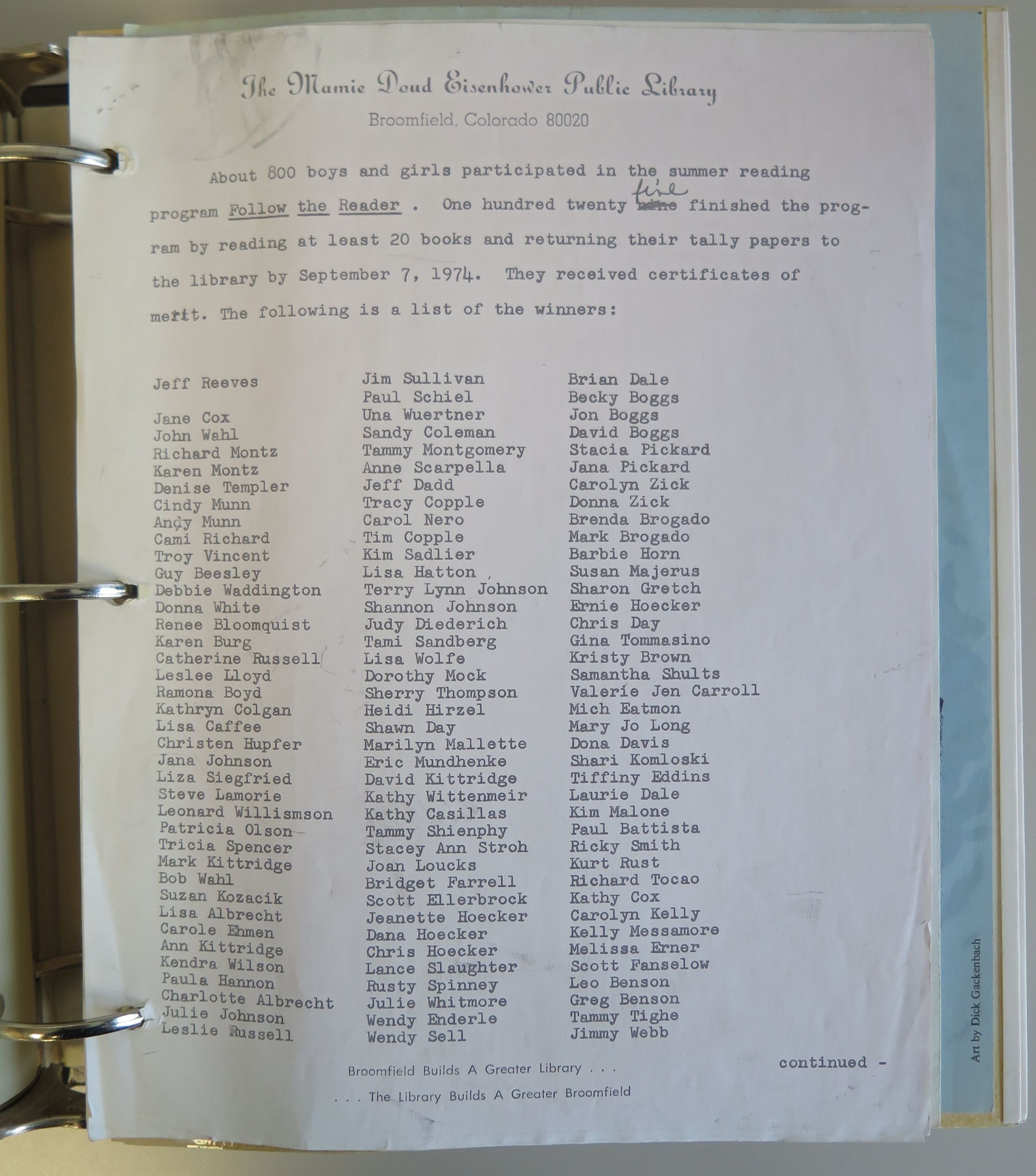 Summer reading program, Star Courier article, Debbie and Ron Sellens, Pet Palace, Schultz and Ron Wittig, Michael Berg and CJ Prince (pantomine), puppet show pictures from December 1, 1979,Gil Nash and Mary Jane Bailey, National Book Week, Don and Jeanne Rutkowski, Village Inn Coupon, Kathy Klatt, Moodys, pictures of children's library, Brendan and Daniel Hrtney, Emerald School, Birch School, June 1982 calendar, Superman Cartoons, Grams Crackers, Joe Young from Rocky Flats, July 1982 calendar, Dungeons and Dragons Club, Air Force Academy Mike Finley, Snackin' Mouse, Richard Shane Wizard, August 1982 calendar, Puppet Craft Fair, Bedtime Story House, "The Book that Saved the Earth", "The Magic Onion", Alma Peacock, Jacqueline Arnold, library budget cuts, mountain man Dick Morgan, "Strike it Rich-Read", free swim coupon, Olivia Stoner with Bookworm float, Reading Rainbow, Six, KRMA TV., Renee and Jeremy Miller, Phillip and Nicole Jacques, Go for the Gold 1984 Summer Reading Program, Dorothy Sager 1984 Volunteer of Year Award, Campbell Soup Company 1984-1985 Labels for Education Program certificate, Readosaurus sponsored by Lakeside Amusement Park programs and coupons, Claudette O'Donnell, Stanleigh the comfort-loving raccoon, Ruthe and George Cloven, Dr. Martin Lockley, Maggie from the Dumb Friends League, Reading Rainbow 1985,Collection