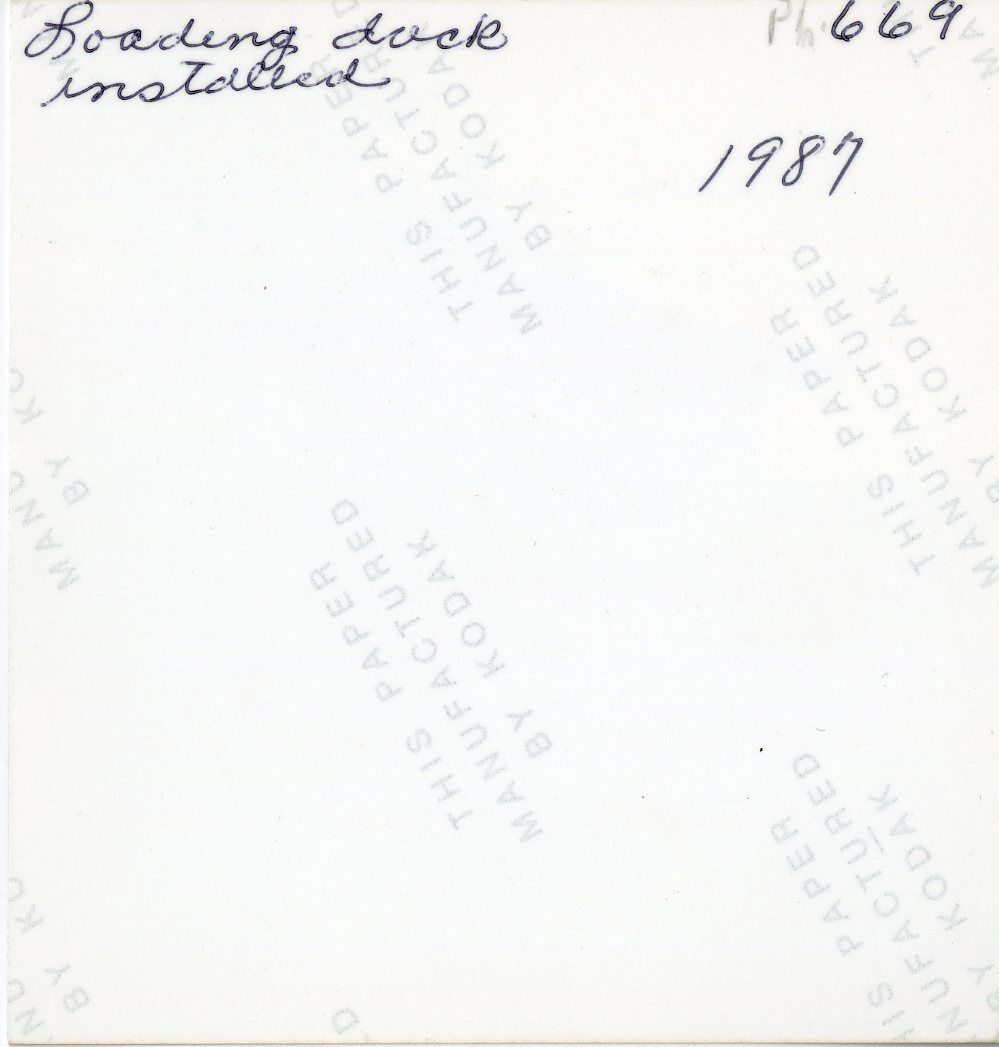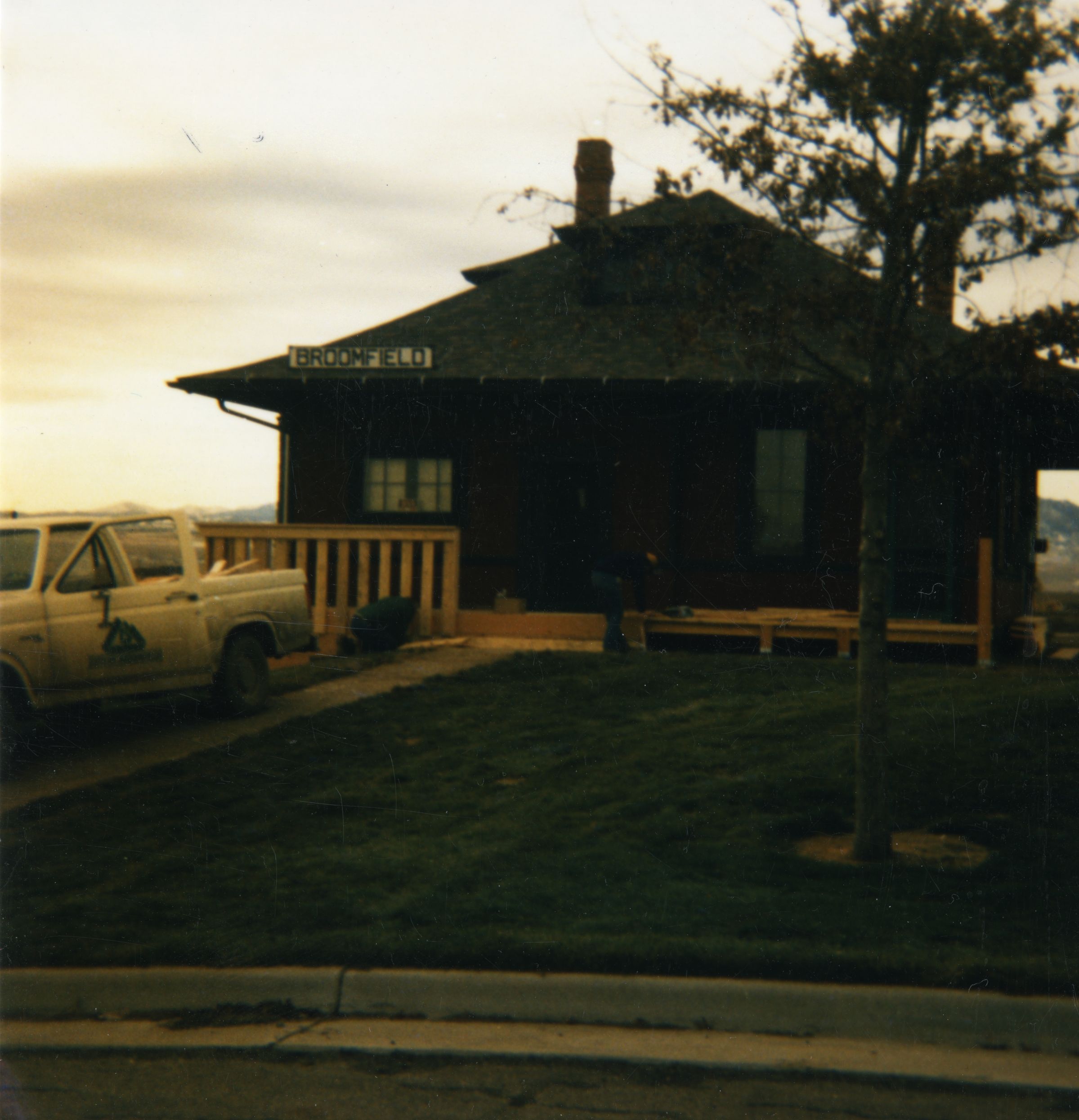 Color photograph of the Broomfield Depot Museum having its front porch installed by the City of Broomfield, 1987. Inscription on the back, in ink, describes the image as "Loading dock installed 1987." A City of Broomfield work truck is parked in front of the museum. Two individuals are shown installing the porch. A tree sits in the forefront of the image, in front of museum, on the right side of the photograph.Collection