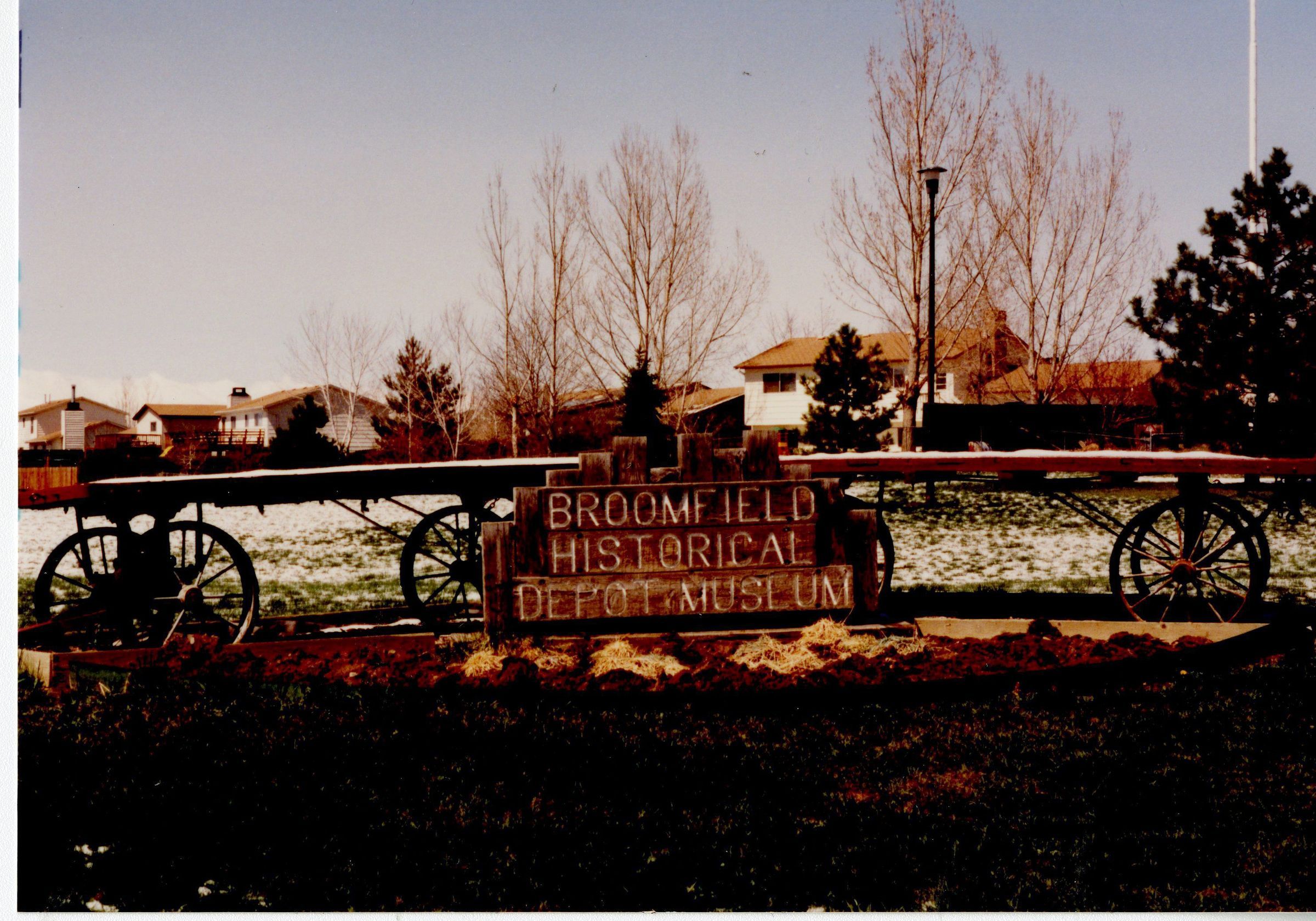 Color photograph showing the sign for the Broomfield Historical Depot Museum. There are houses in the background.