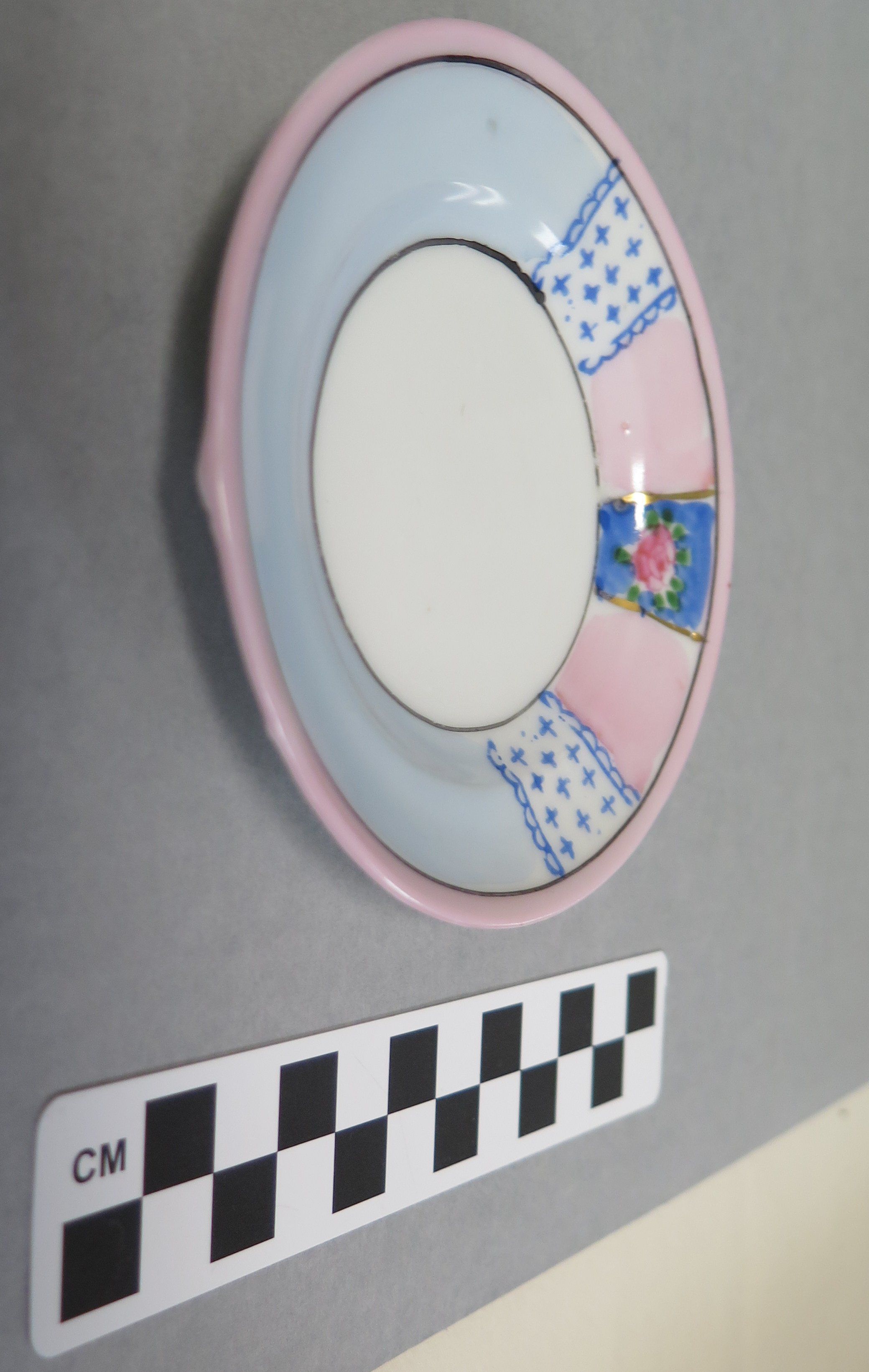 1/4 plates in toy tea set. Pink, blue, and white design
