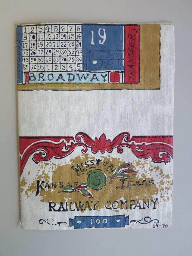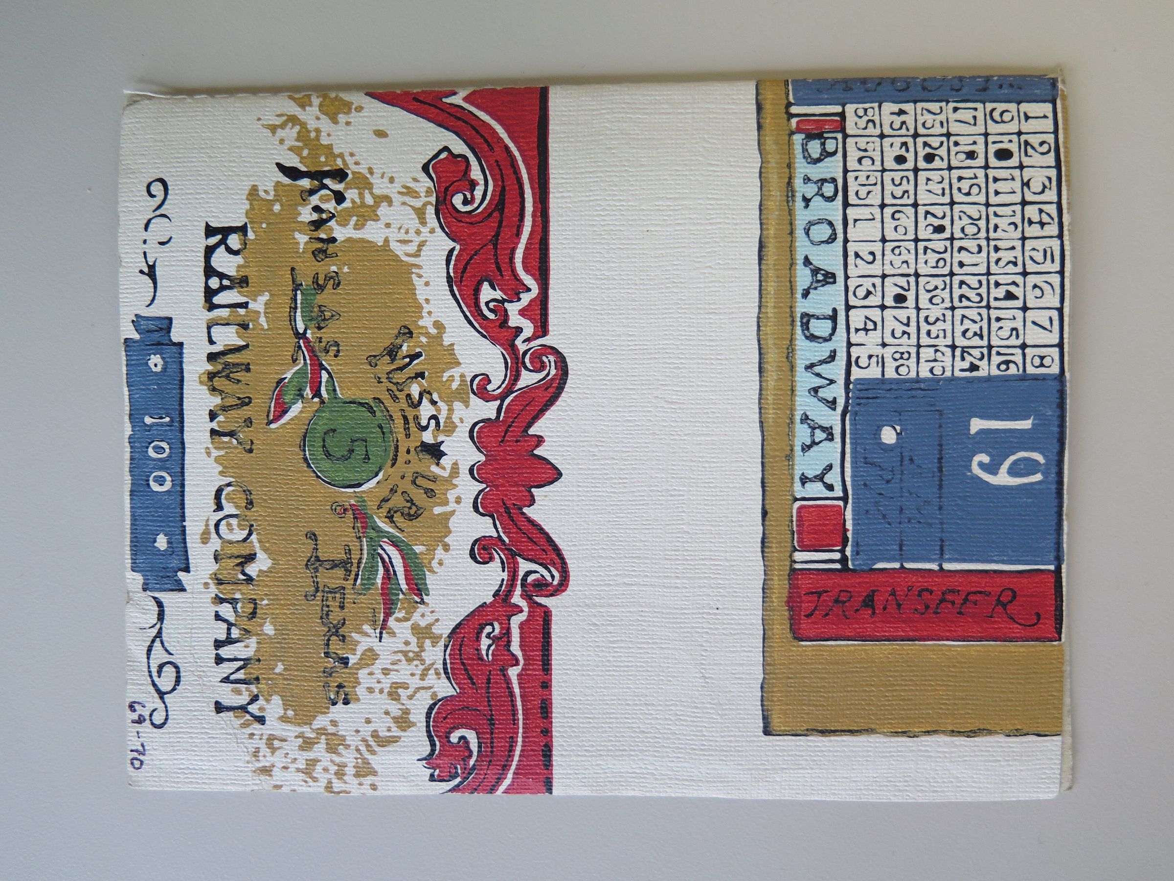 Miniature booklet with cover made of old wallpaper (red, blue, and gold on white, railroad sign design). 4.5 x 6in