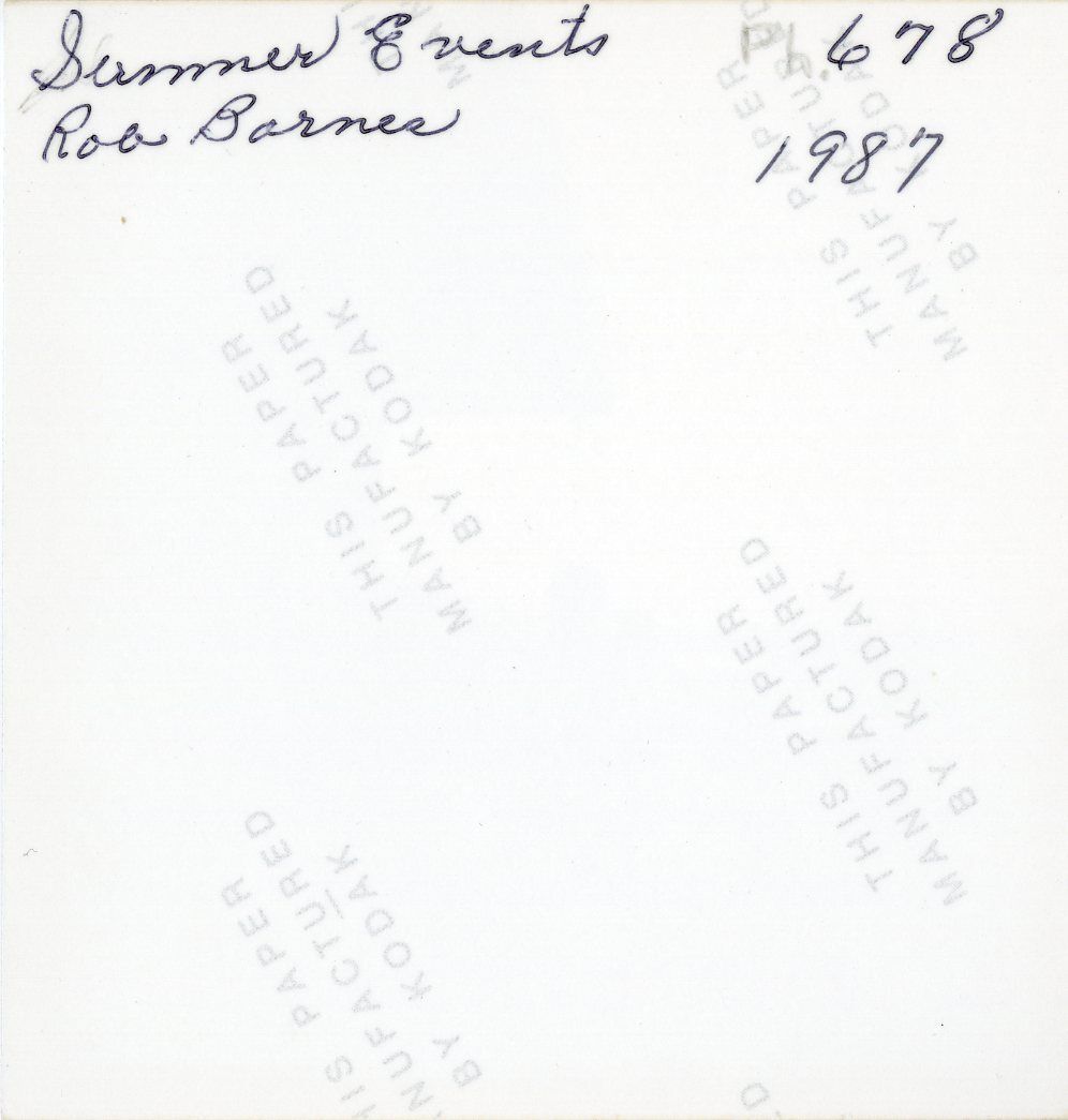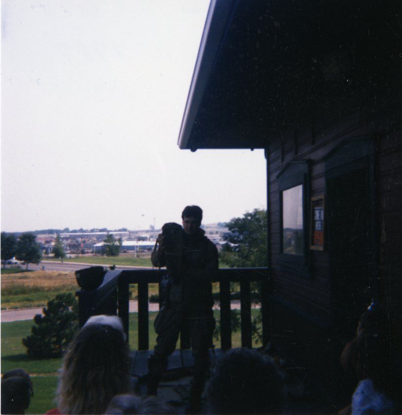 Color photograph of Rob Barnes presentation at the Broomfield Depot Museum, 1987. Inscription on the back, in ink, describes "Summer Events Rob Barnes 1987." Barnes presents in military clothing on the front porch next to railing of the depot. Two individuals' heads from the audience are visible at the bottom of photograph. The depot's entrance is on the right side of the image. Trees, buildings and a street are in the background behind Barnes.Collection