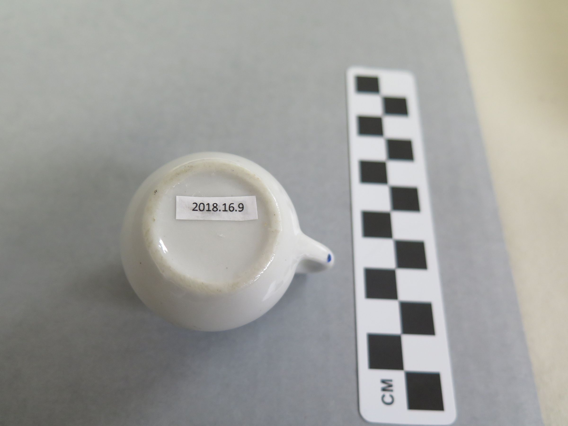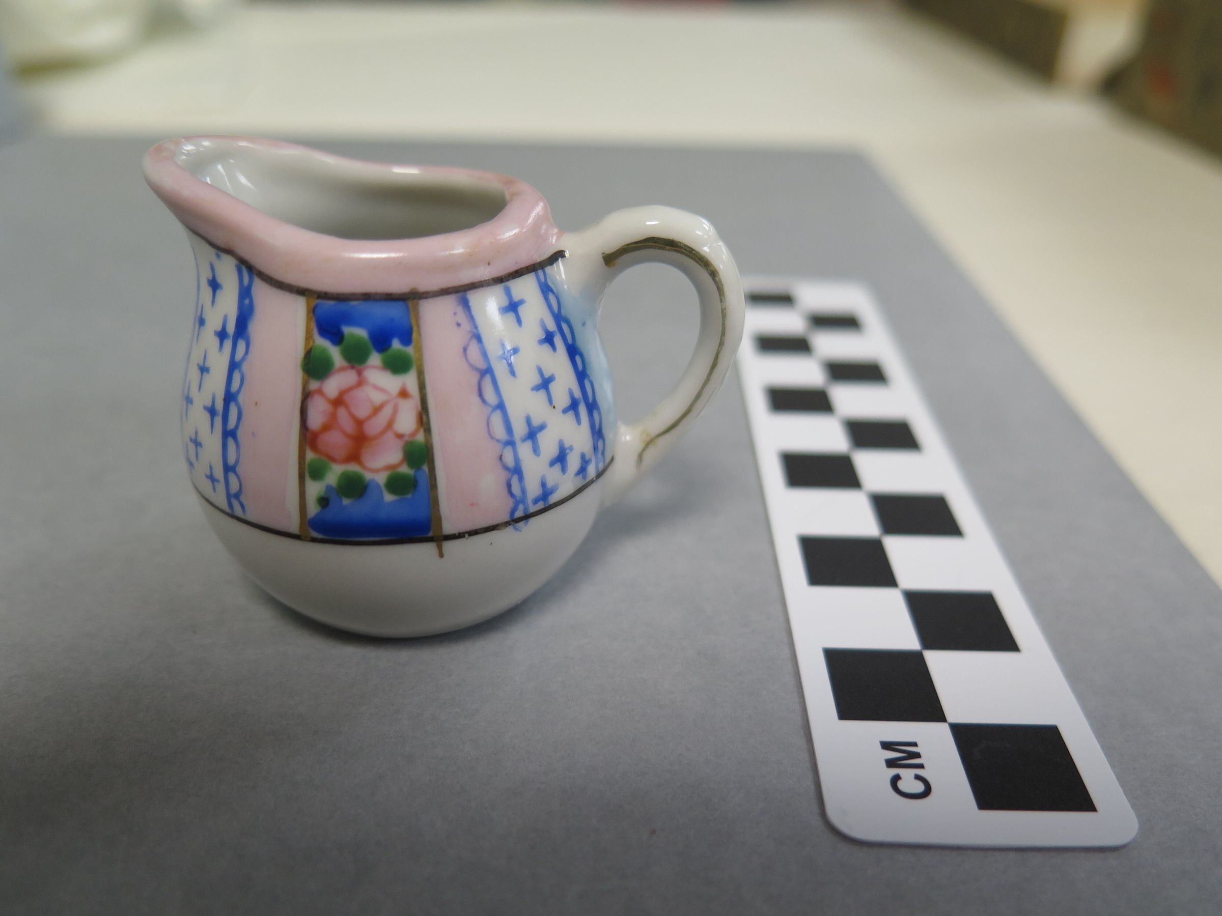 Cream pitcher from toy tea set. Pink, blue, and white design