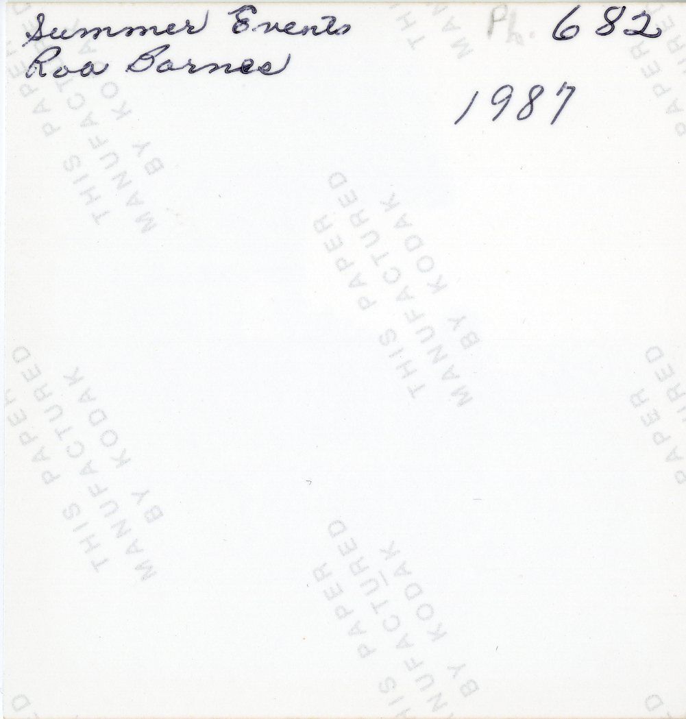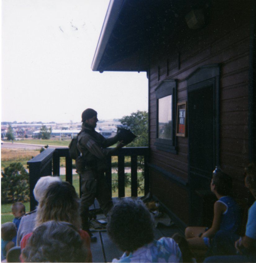 Color photograph of Rob Barnes presenting at the Broomfield Depot Museum. Inscription on the back, in ink, describes "Summer Events Rob Barnes 1987." Rob Barnes stands on the front porch of the museum dressed in military clothing left of center in the photo. Eight people sit a the bottom of the image in the foreground watching Barnes' presentation. The museum's front door is on the right side of the image with a "come in we're open" sign hanging next to the front door. Buildings and trees lay in the distance behind the railing in the upper left corner of the photograph.
