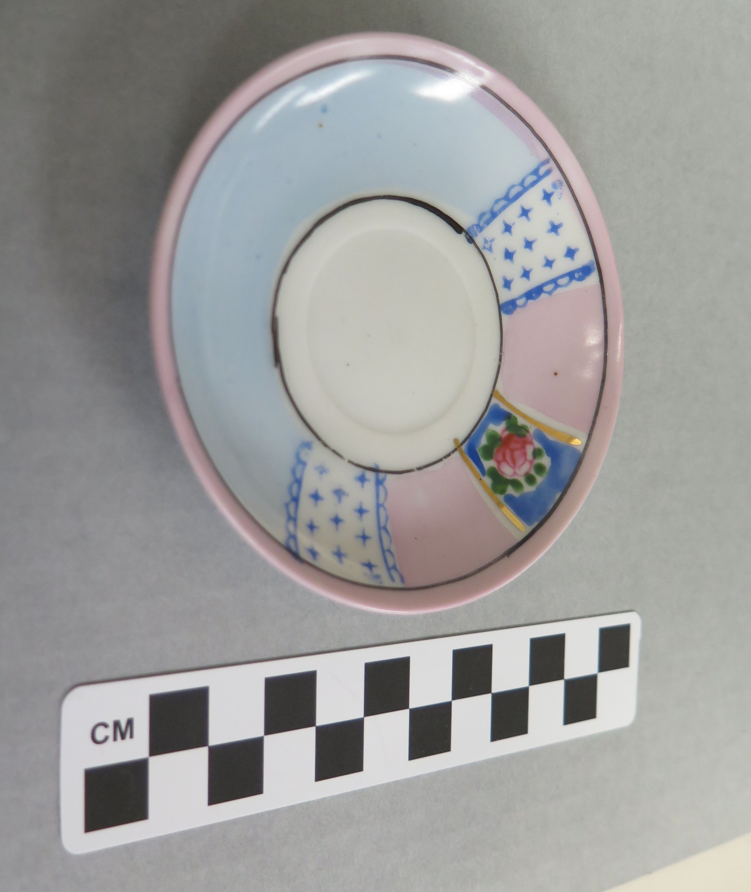 3/4 saucers from toy tea set. Pink, blue, and white design