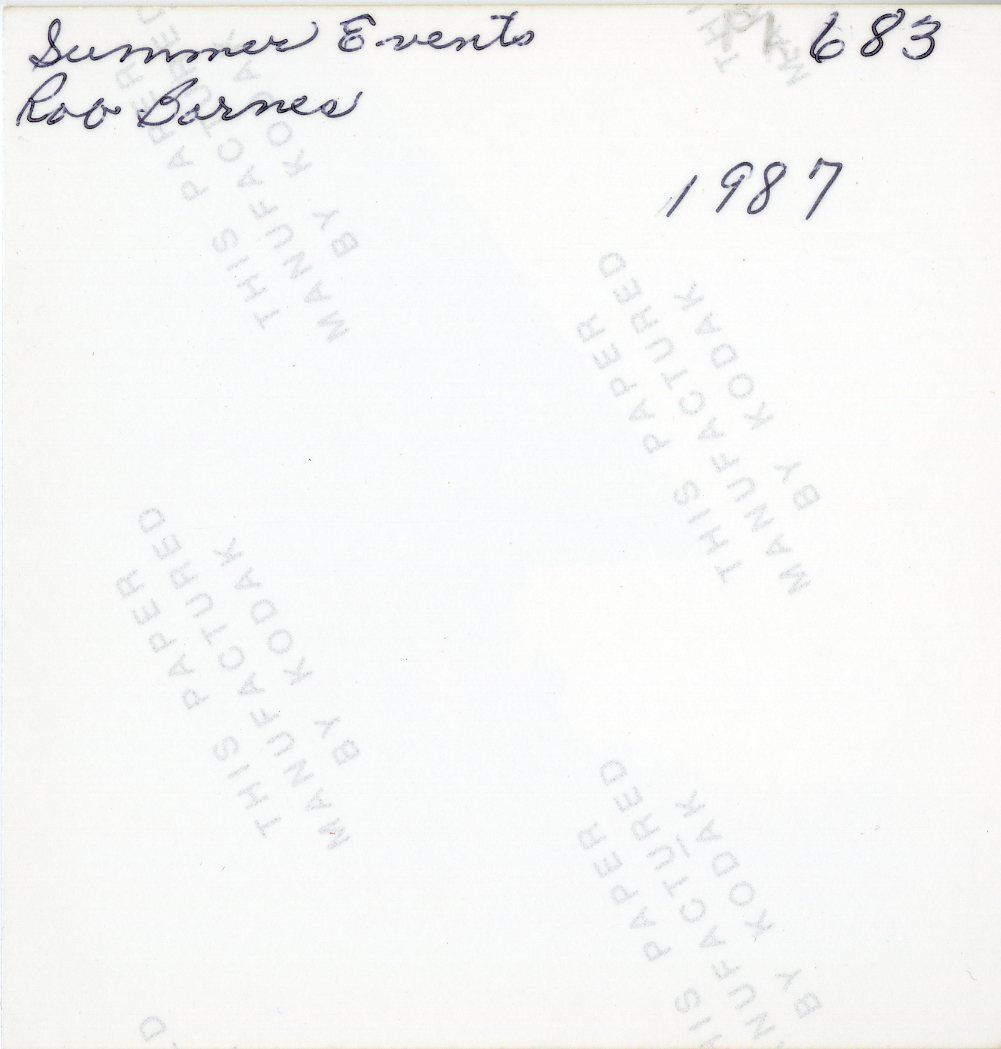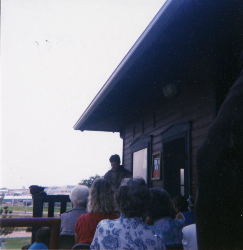 Color photograph of Rob Barnes presenting at the Broomfield Depot Museum, 1987. Inscription, in ink, on the back of the photograph describes "Summer Events Rob Barnes 1987." The museum is on the left side of the photo. Barnes stands in front of the museum in the center of the image. Four adults and two children sit watching Barnes' presentation at the bottom center of the photograph. Buildings and trees are in the background behind the museum's railing in the bottom left corner of the image. A "come in we're open" sign hangs on the outside of the museum next to the front door, located towards the right center of the image.Collection