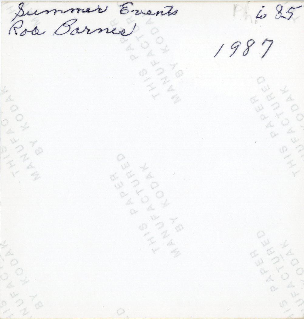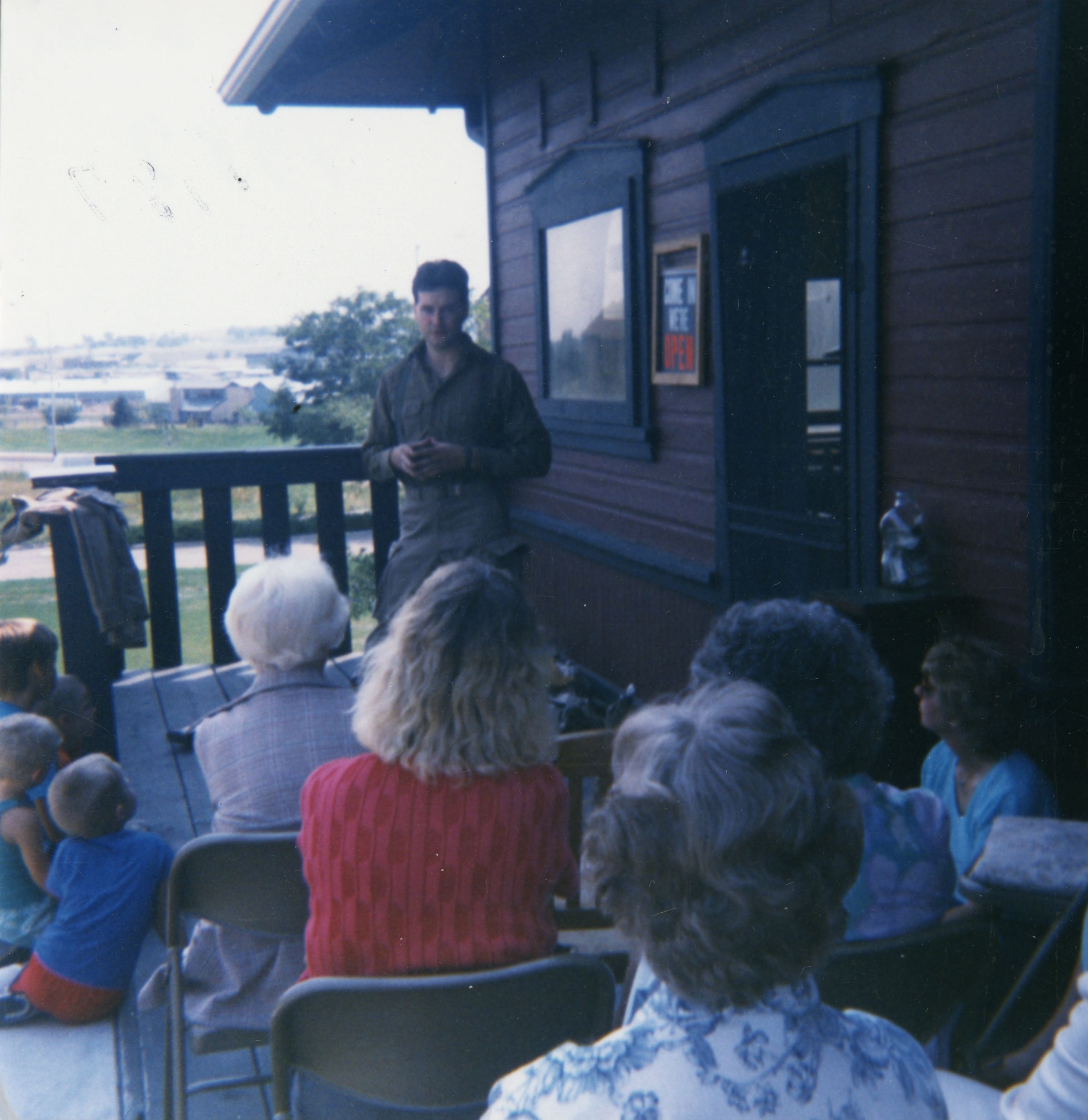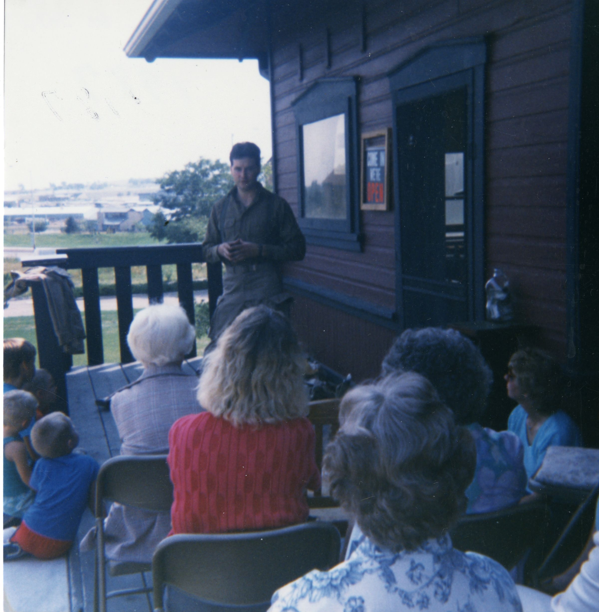 Color photograph of Rob Barnes presenting at the Broomfield Depot Museum, 1987. Inscription, in ink, on the back of the photograph describes "Summer Events Rob Barnes 1987." Barnes stands in center of photo. Five adults are seated in metal chairs at the bottom of the image. Four children sit on front porch of the depot watching Barnes on the left side of the image. The front door of the museum is located on the right side of the image, with a "come in we're open" sign hanging next to the front door. Buildings and trees are in the background in the upper left corner of the photograph.Collection