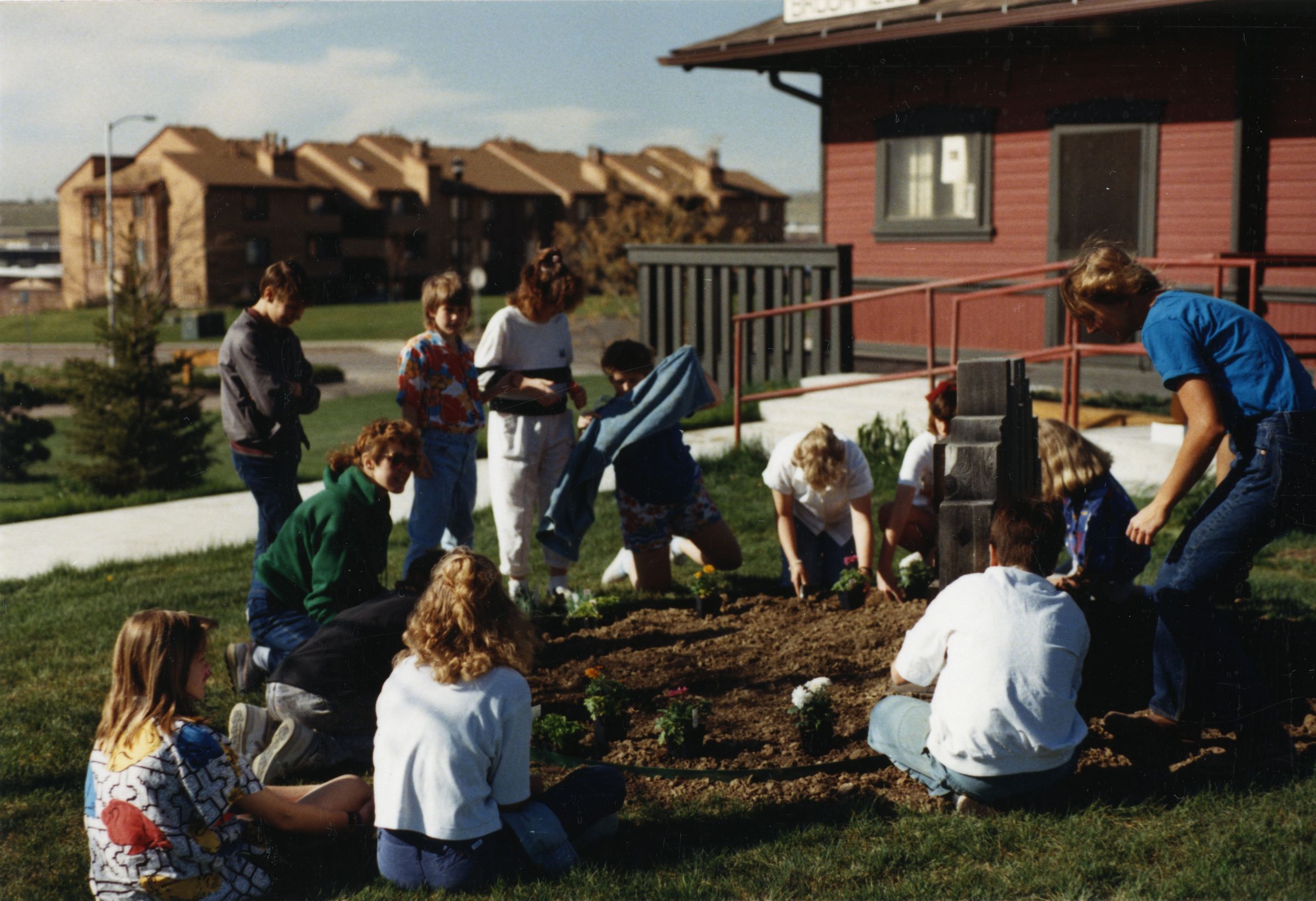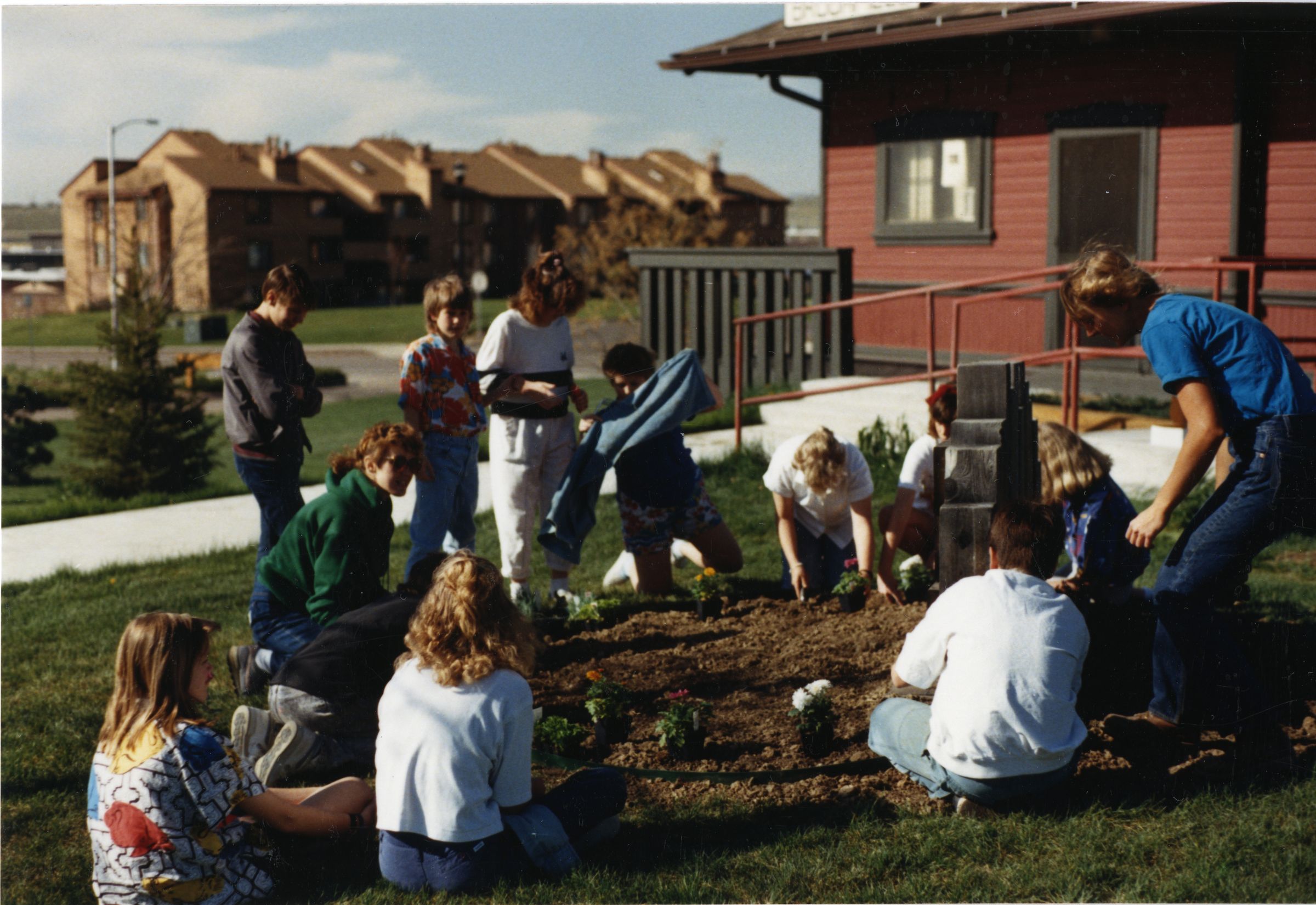 Color photograph print of kids in front of the Broomfield Depot Museum, 1988. Thirteen kids stand, sit and kneel around dirt planting flowers in front of the depot. A sidewalk leads from the left side of the photograph to the front entrance of the museum, behind the kids. Apartment buildings and trees are in the background on the upper left side of the image.