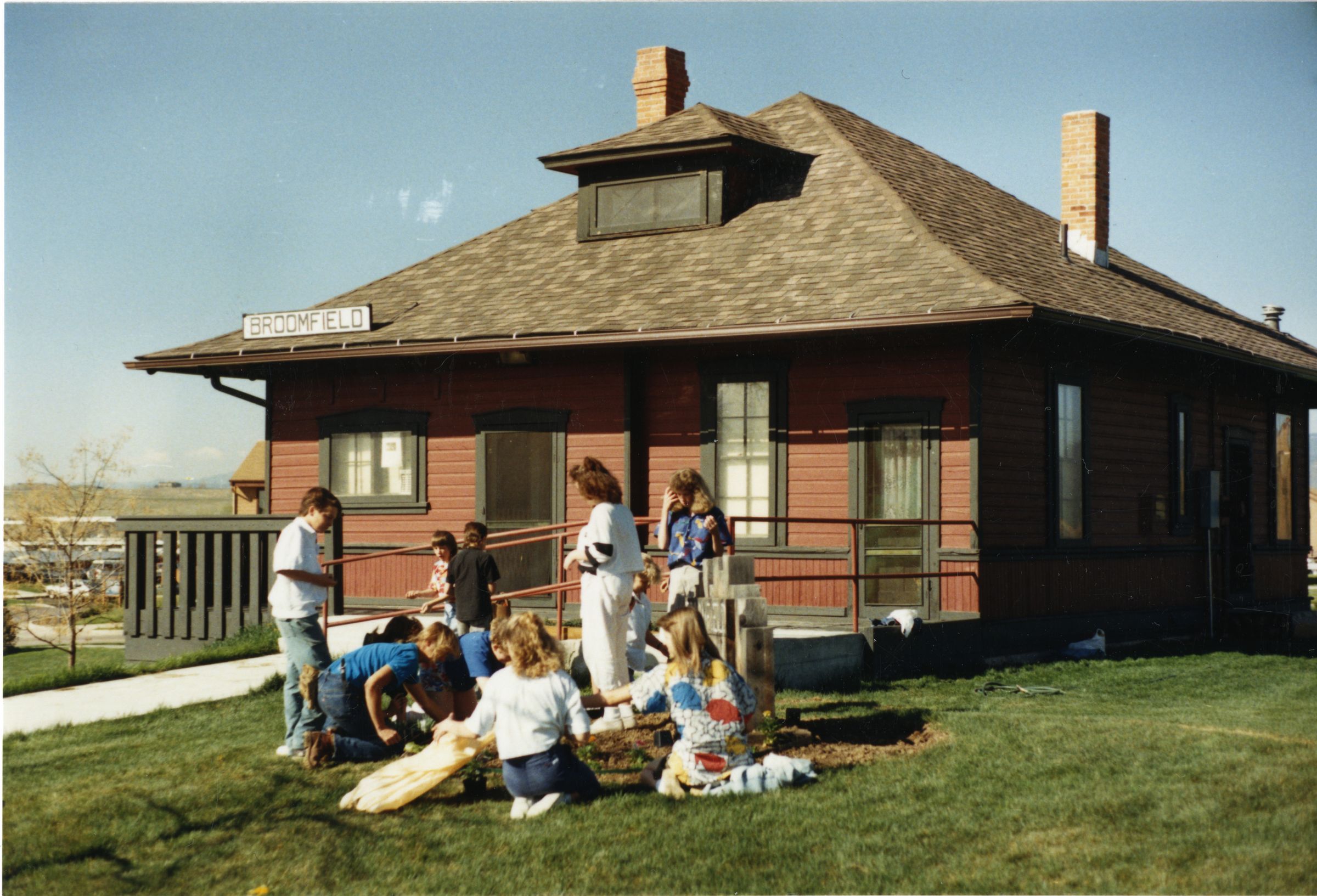 Kids Planting Near the Broomfield Historical Depot Sign and Museum