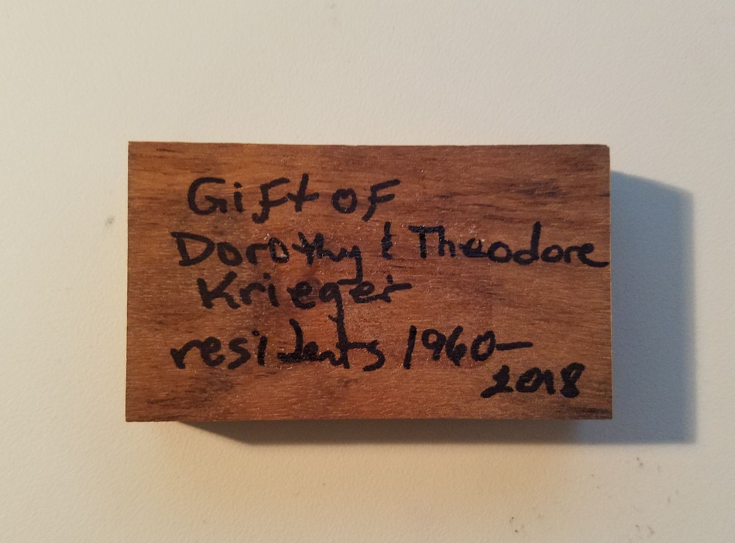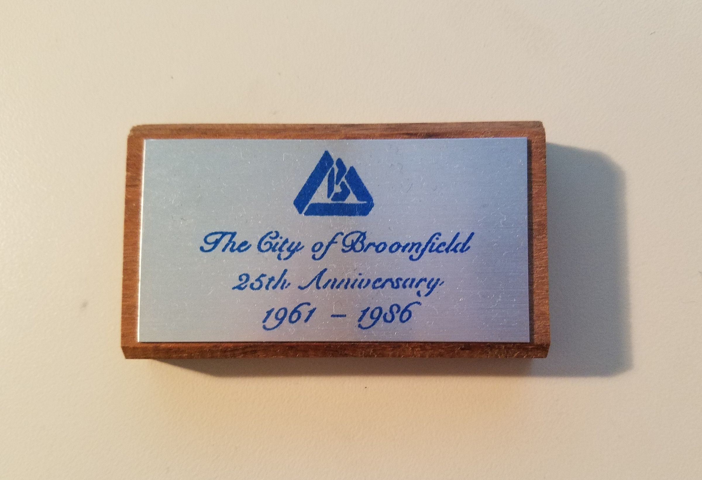 Plaque commemorating the 25th anniversary of the city of Broomfield. On the front is inscribed "The City of Broomfield 25th Anniversary 1961-1986," and on the back is written in black marker "Gift of Dorothy & Theodore Krieger residents 1960-2018"