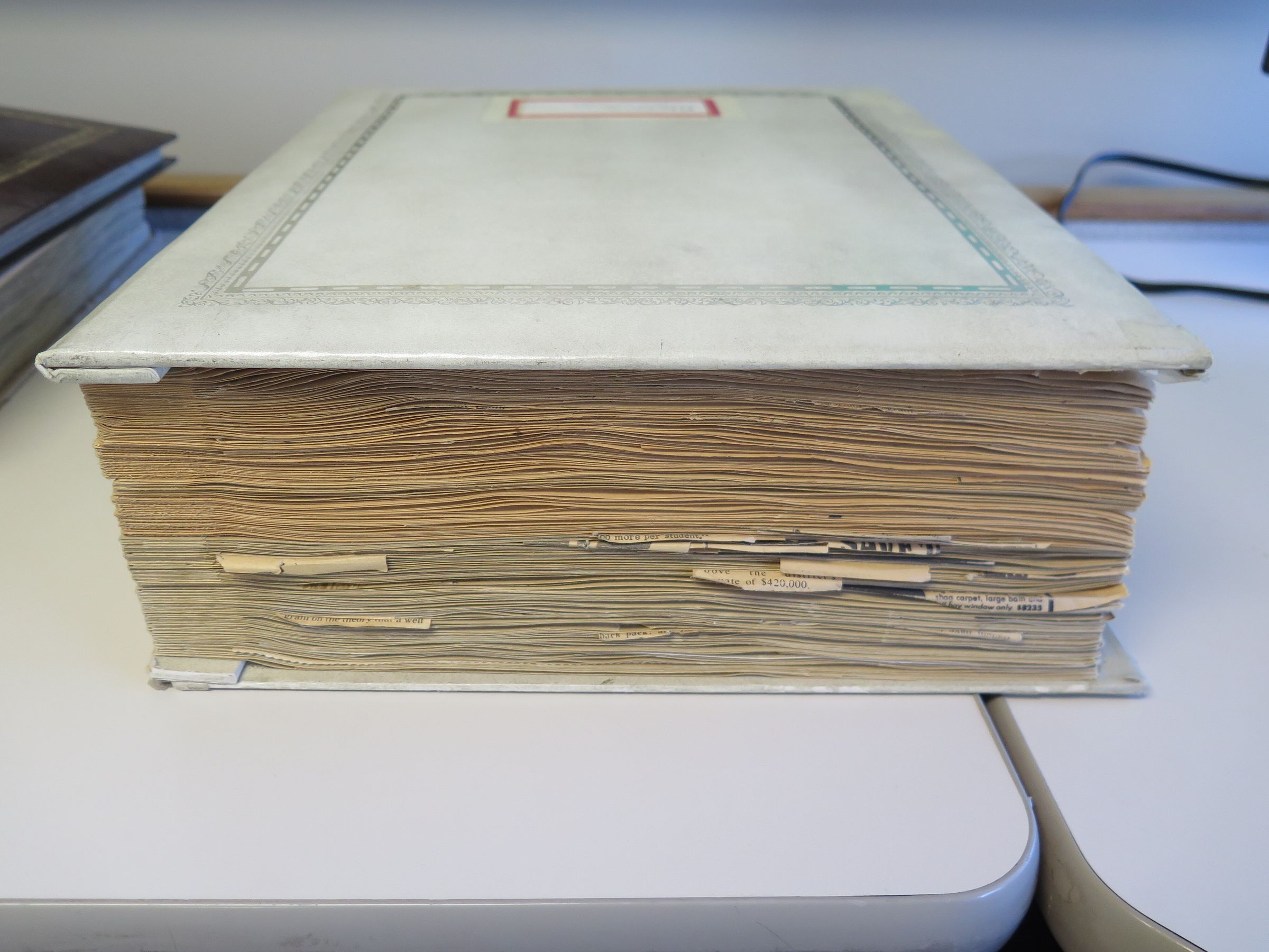Cover is a cream vinyl, no binding. 4.5in deep, 12in x 14.5in Fragile. Some loose articals inside.Collection