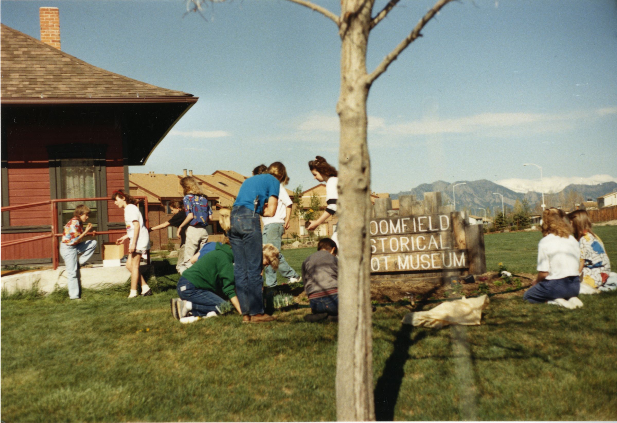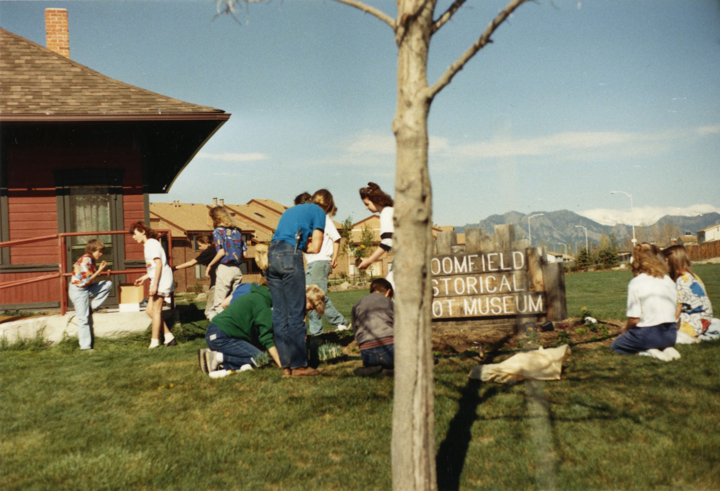 Color photograph print of kids by the Broomfield Historical Depot Museum sign, 1988. A section of the Broomfield Depot Museum is in the background on the upper left corner of the image. Kids are standing, kneeling and sitting on the grass in front the depot and the sign. A tree stands in the foreground in the center of the picture. The mountains are in the background on the center right side of the photograph.