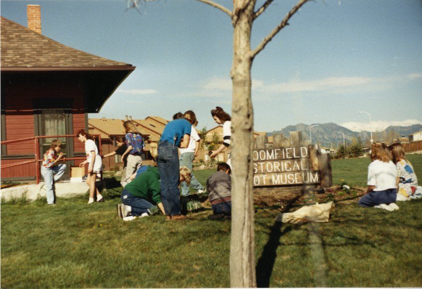 Kids Planting Near the Broomfield Historical Depot Sign and Museum