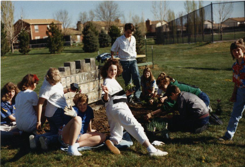 Kids Planting Near the Broomfield Historical Depot Sign and Museum