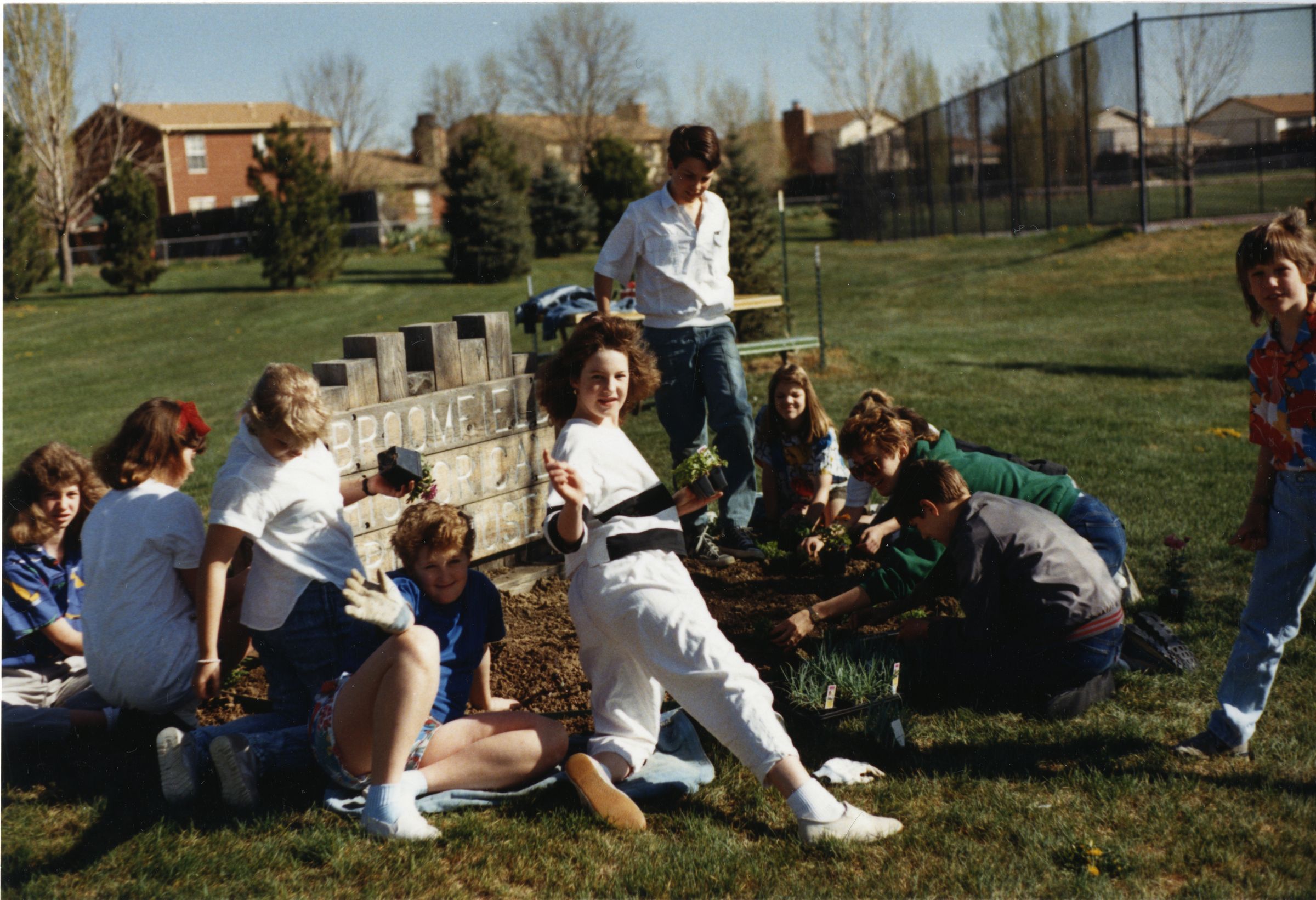 Color photograph print of kids by the Broomfield Historical Depot Museum sign, 1988. The kids sit, stand and kneel in various poses around the sign on the grass. Many of the kids are planting flowers in the dirt around the sign. Houses, trees and an area enclosed by a fence are in the background at the top of the photograph.