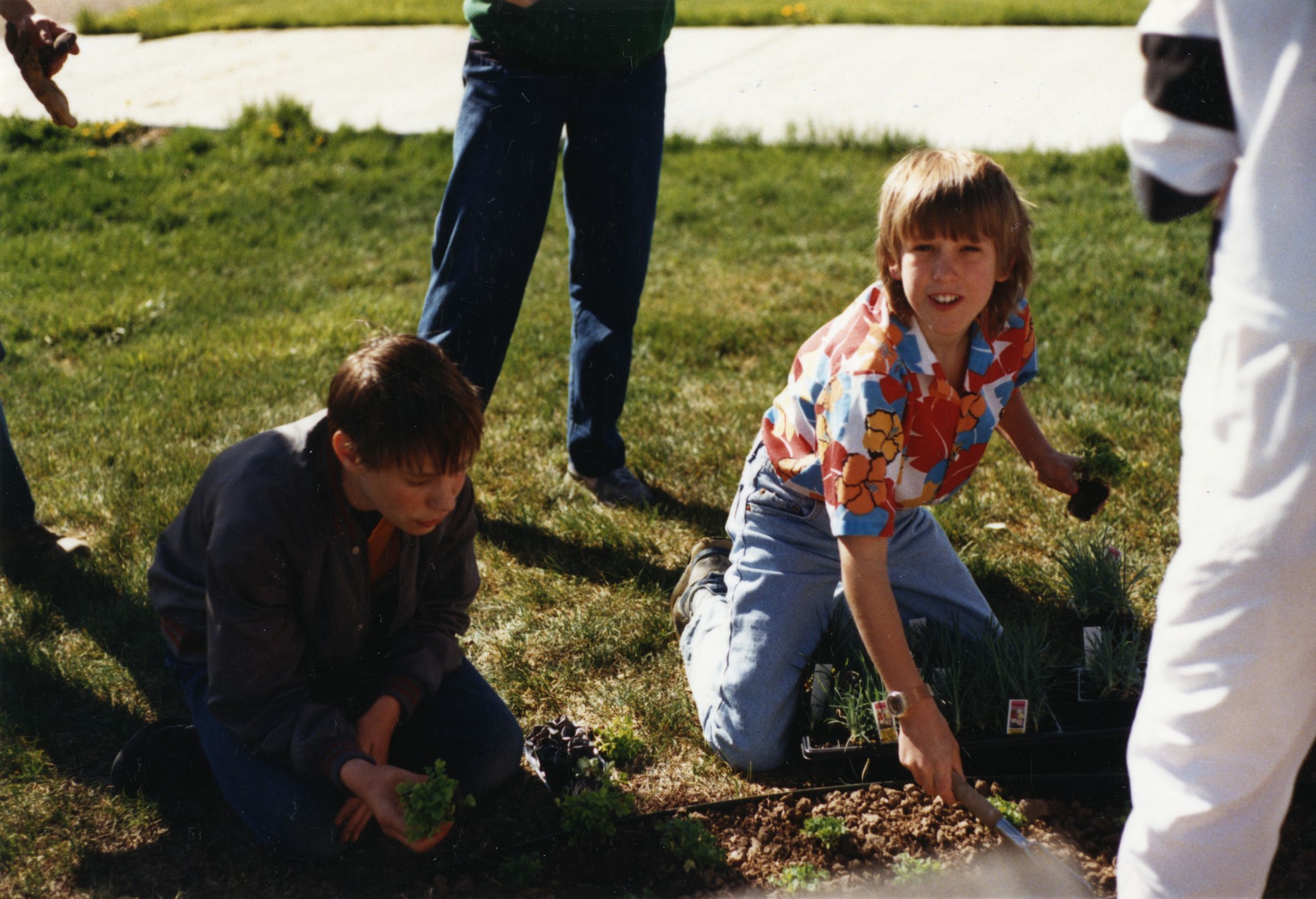 Color photograph print of kids planting at the Broomfield Depot Museum, 1988. Two boys kneel on the grass in the center of the photograph, one looking at the camera. The boys are planting flowers at the bottom of the image. Lower body of a person stands behind the boys on the grass at the top of the photograph. On the right side of the image a person dressed in white stands in front of the boys.