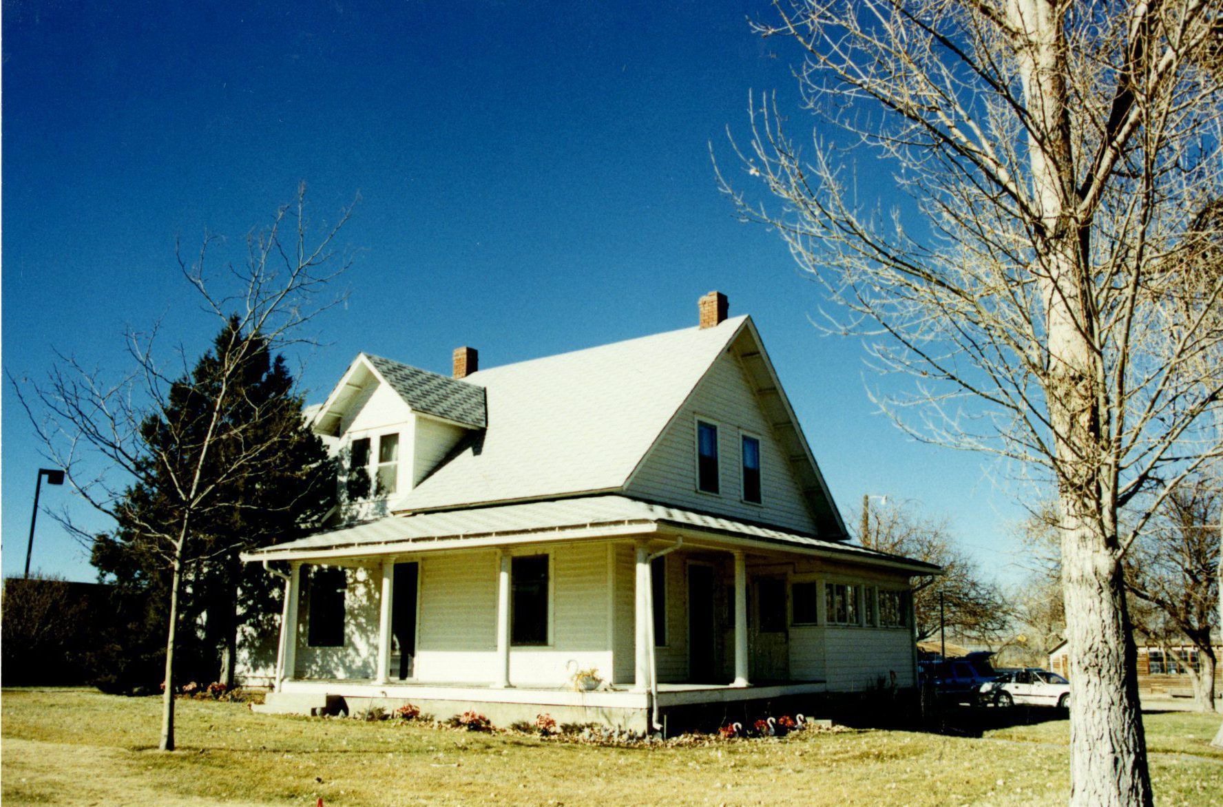Small white house on the Brunner Property, with two trees in the front and a few cars in the back parked by the house. Written on back: 2-9Photograph Details