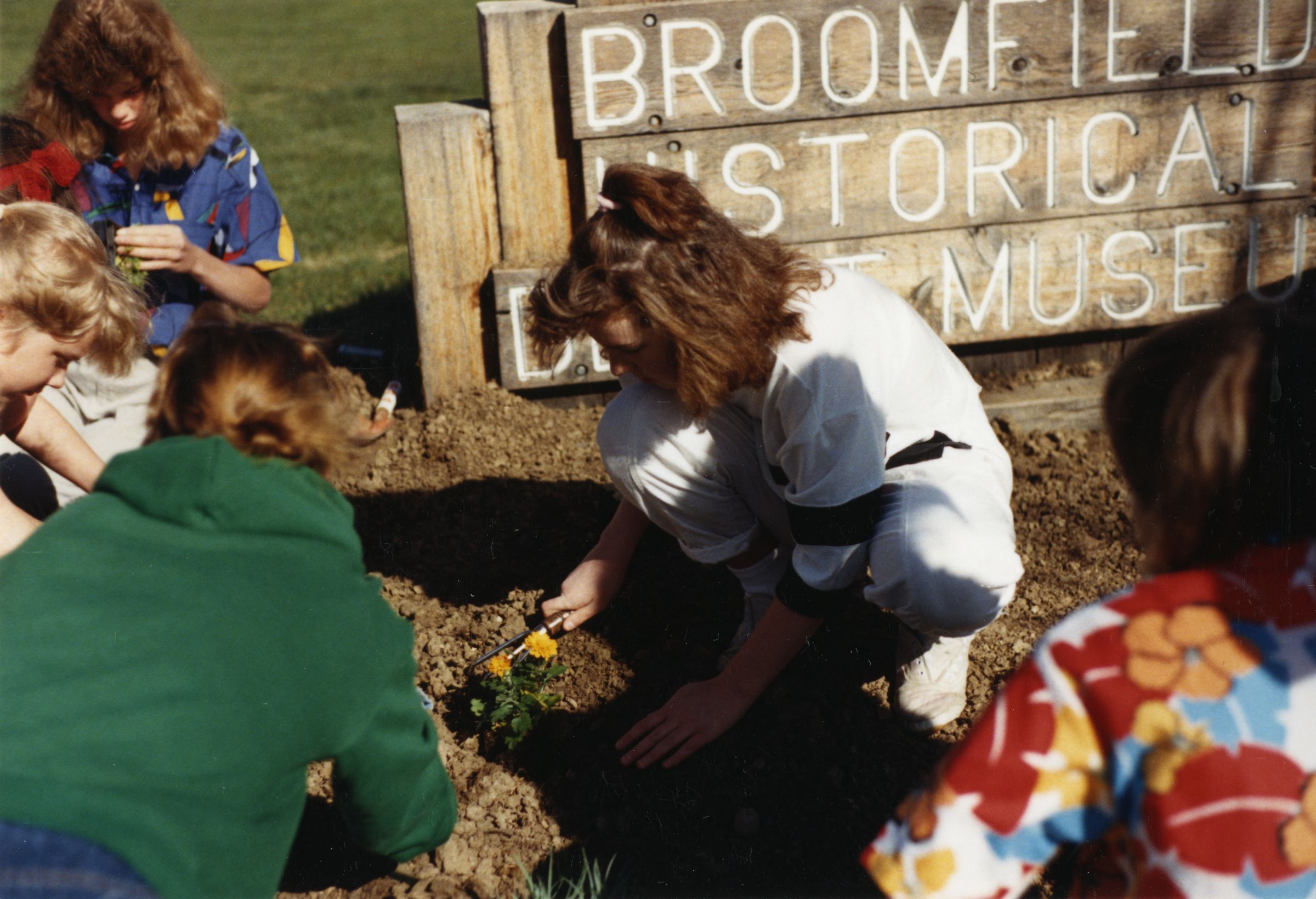 Color photograph print of kids in front of the Broomfield Historical Depot Museum sign, 1988. The kids are planting flowers in the dirt in front of the sign. In the center of the image, a girl in white digs in the dirt around flowers. Three kids plant flowers on the left side of the photo. A child with a floral pattern shirt is seen from behind in the foreground, near the right edge of the image.