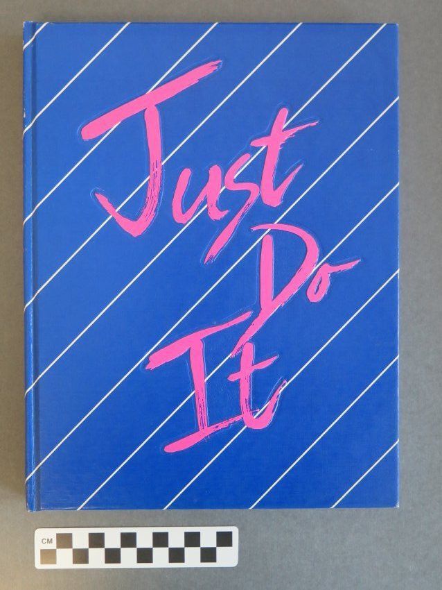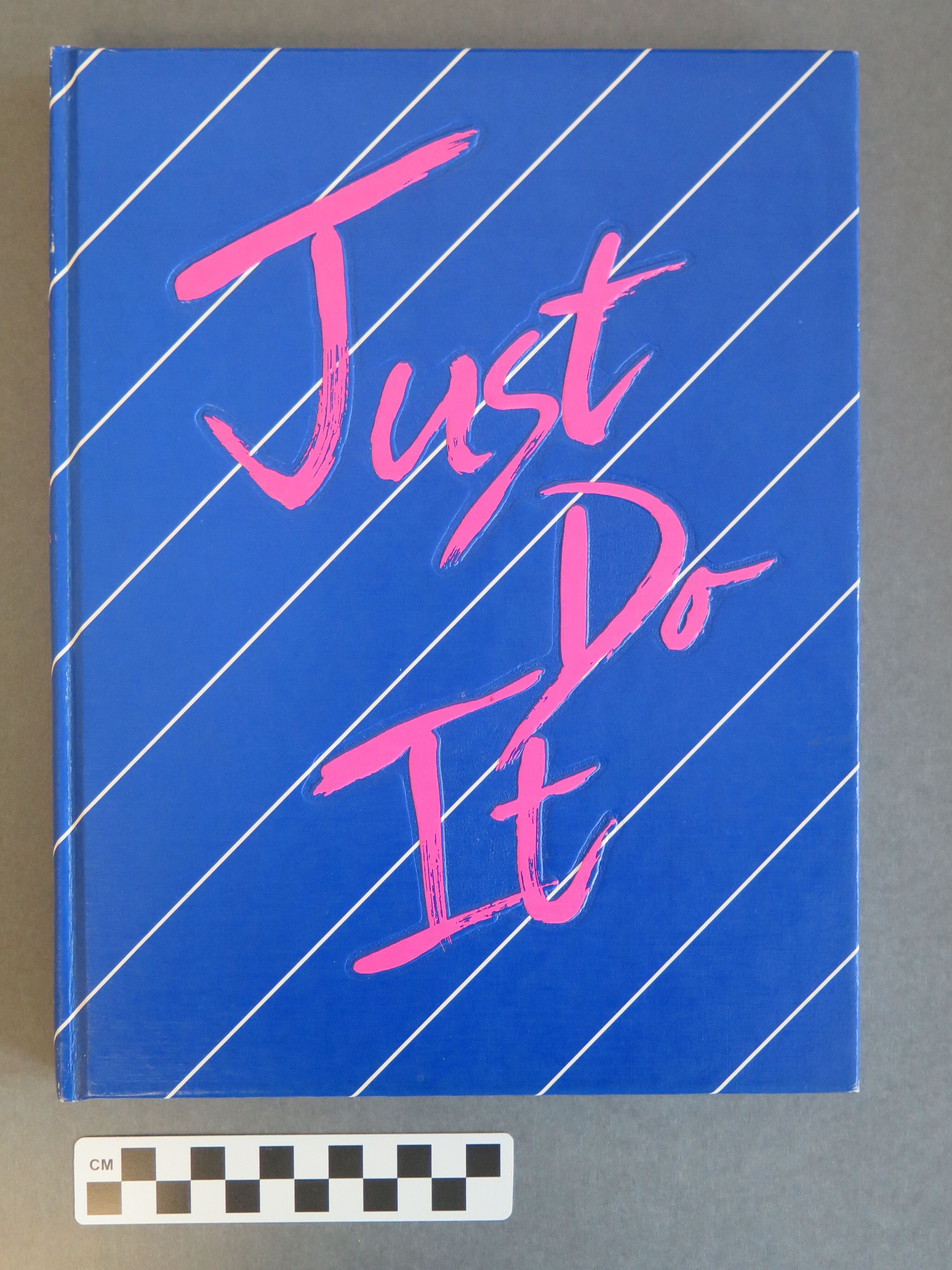 Cover is blue with white pinstripes and in pink lettering, "Just Do It."