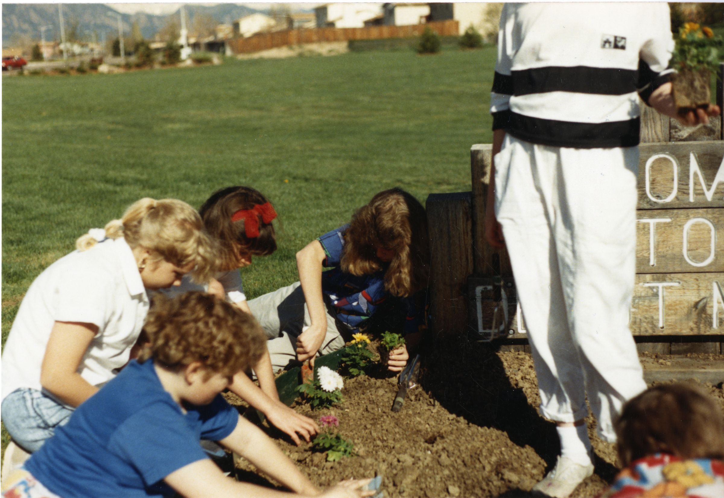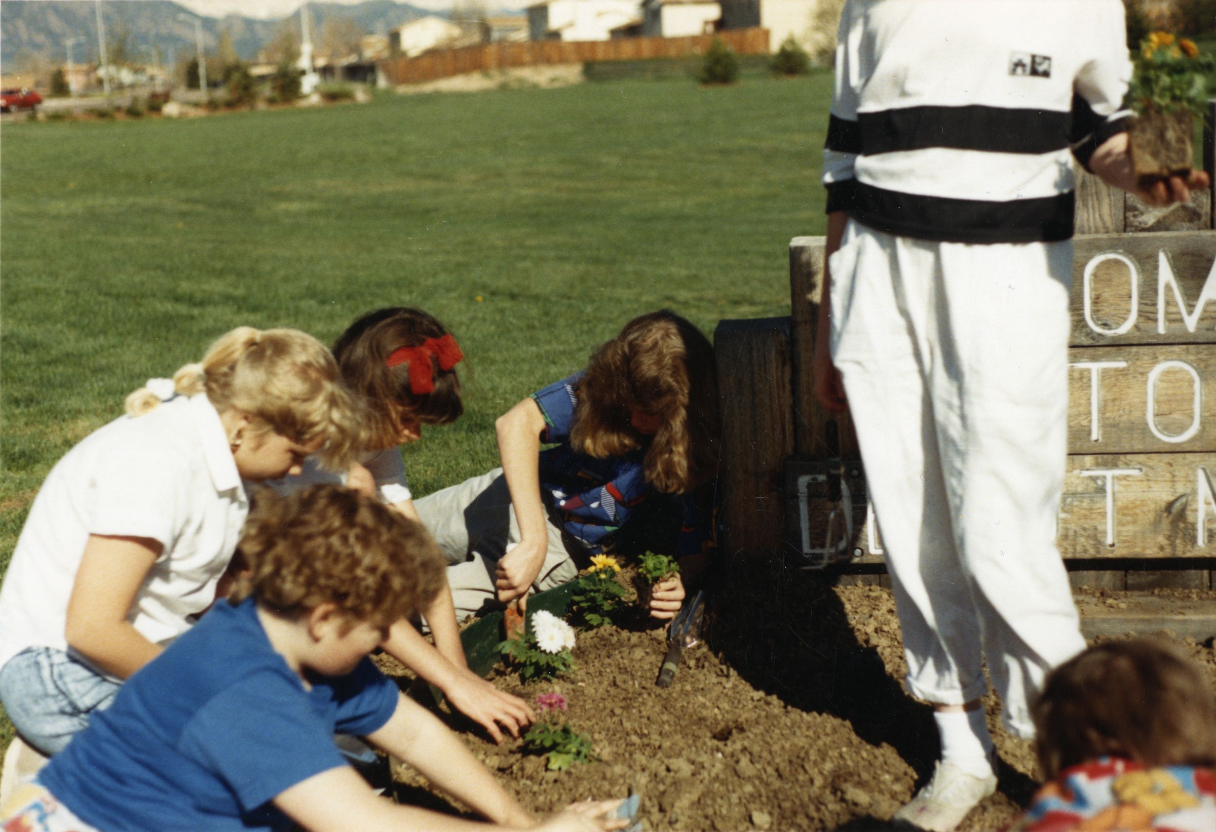 Color photograph print of kids by the Broomfield Historical Depot Museum sign, 1988. Four kids plant flowers in the dirt around the sign. One person, wearing white, stands on the right side of the photo holding a flower. Grass is in the background. Houses, a fence line and mountains are in the background at the top left of the image.
