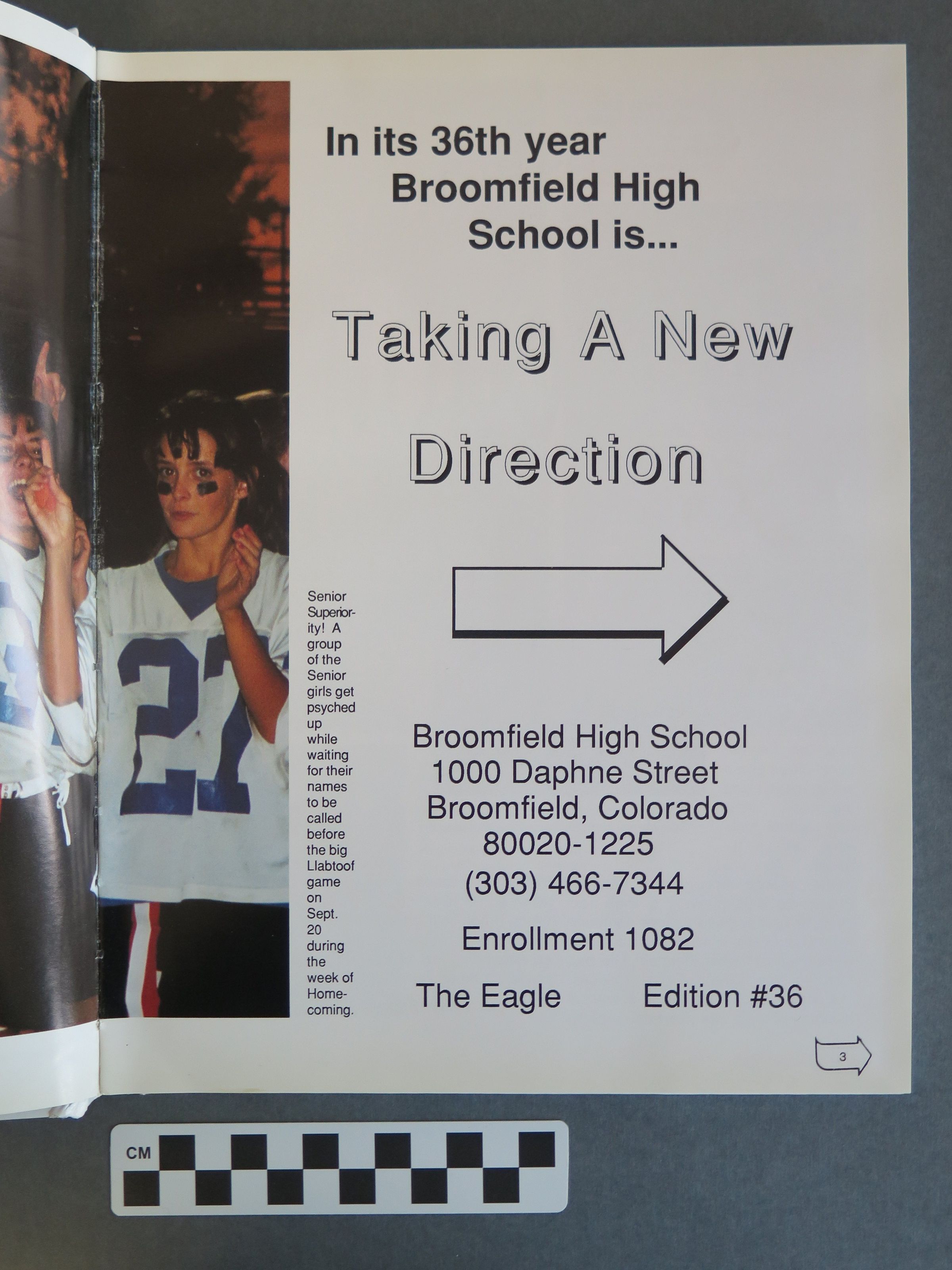 1993 Broomfield High School Yearbook, Volumn 35, Hardcover, 178 pages Cover is dark blue and black mottled design with "Nineteen Ninty 3 / Broomfield" written in silver lettering. No inscriptions.