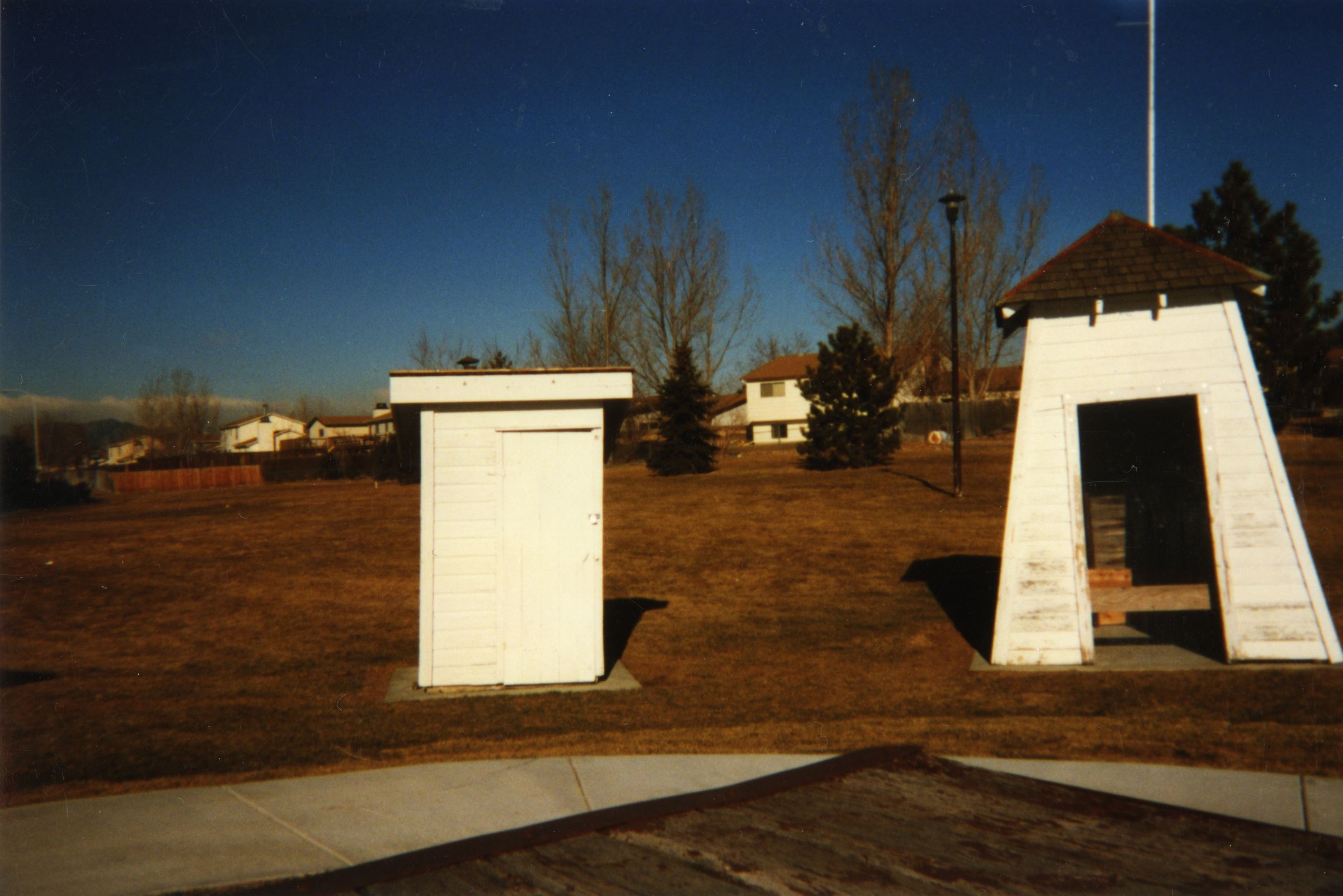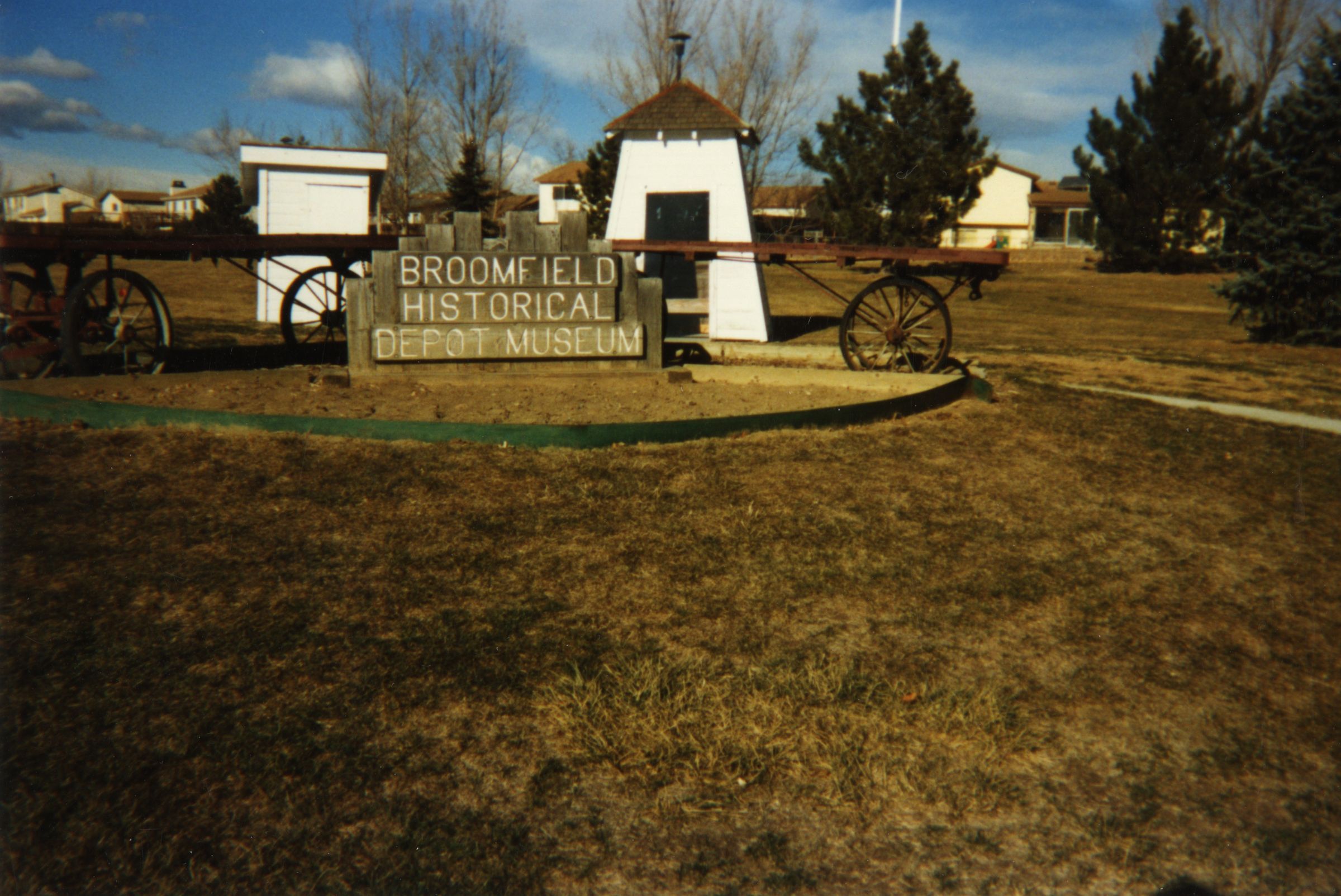 Two color photographs of outside areas of the Broomfield Depot Museum, circa 1995. The prints are 3.5" x 5", resin coated. One print shows the outhouse and water pump structures outside of the depot, while the other shows the Broomfield Historical Depot Museum sign.Collection
