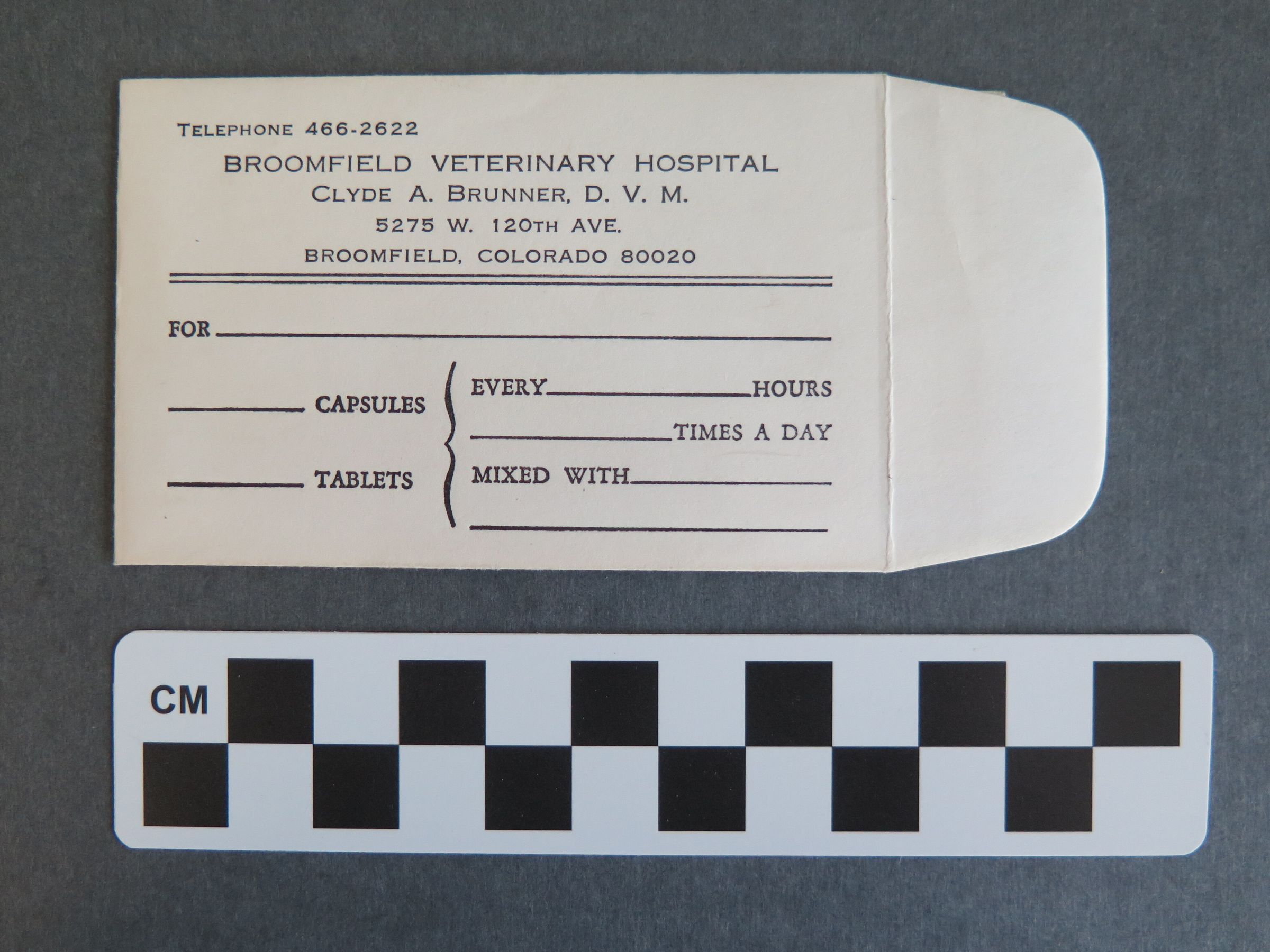 Pill sleeve, labelled with Dr. Clyde A. Brunner 's name, address and telephone. Includes space to record prescription instructions.