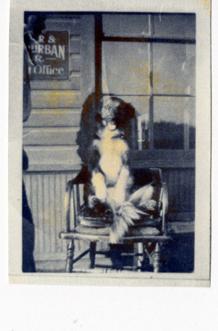 This a black and white photo of Brownie the dog in front of the Broomfield train depot. In this photo Brownie is seen sitting in a chair almost human like. Behind Brownie is living room window over the dog's left shoulder. While over the right dog's right shoulder is the old sign to the Depot office.