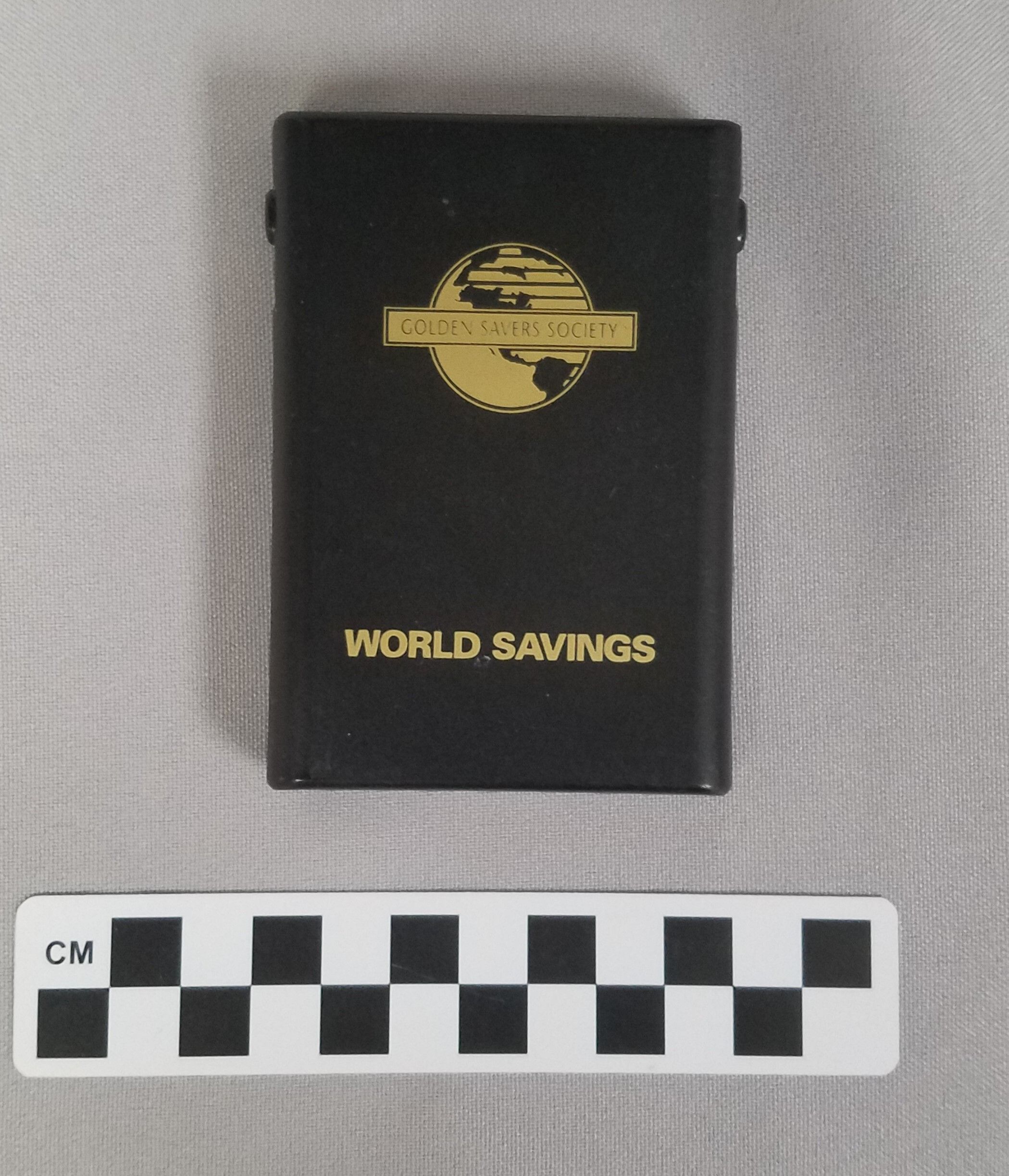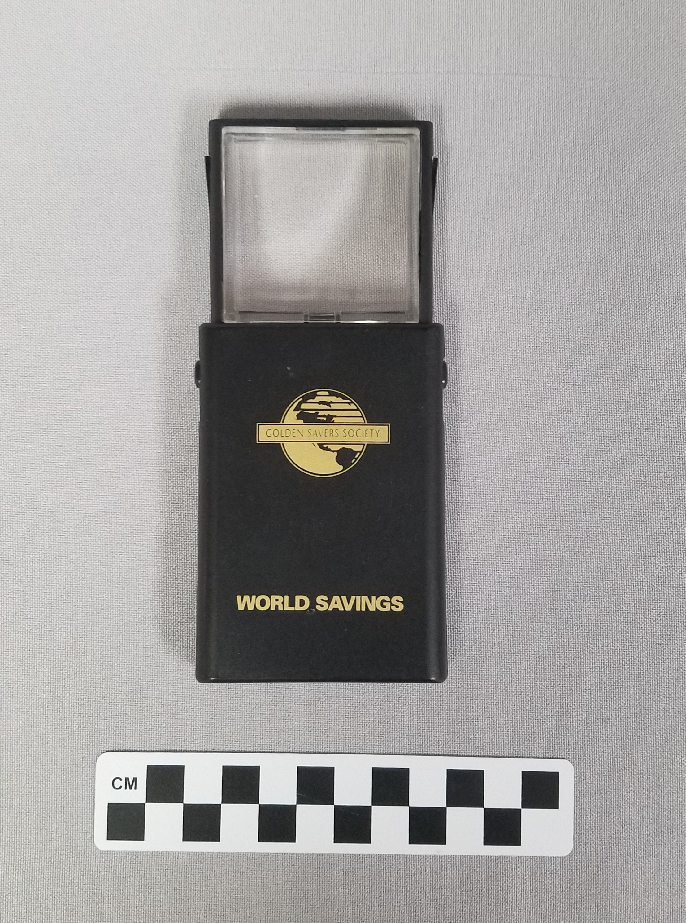 Black plastic pop-up magnifying glass. Written on front is "Golden Savings Society / World Savers".