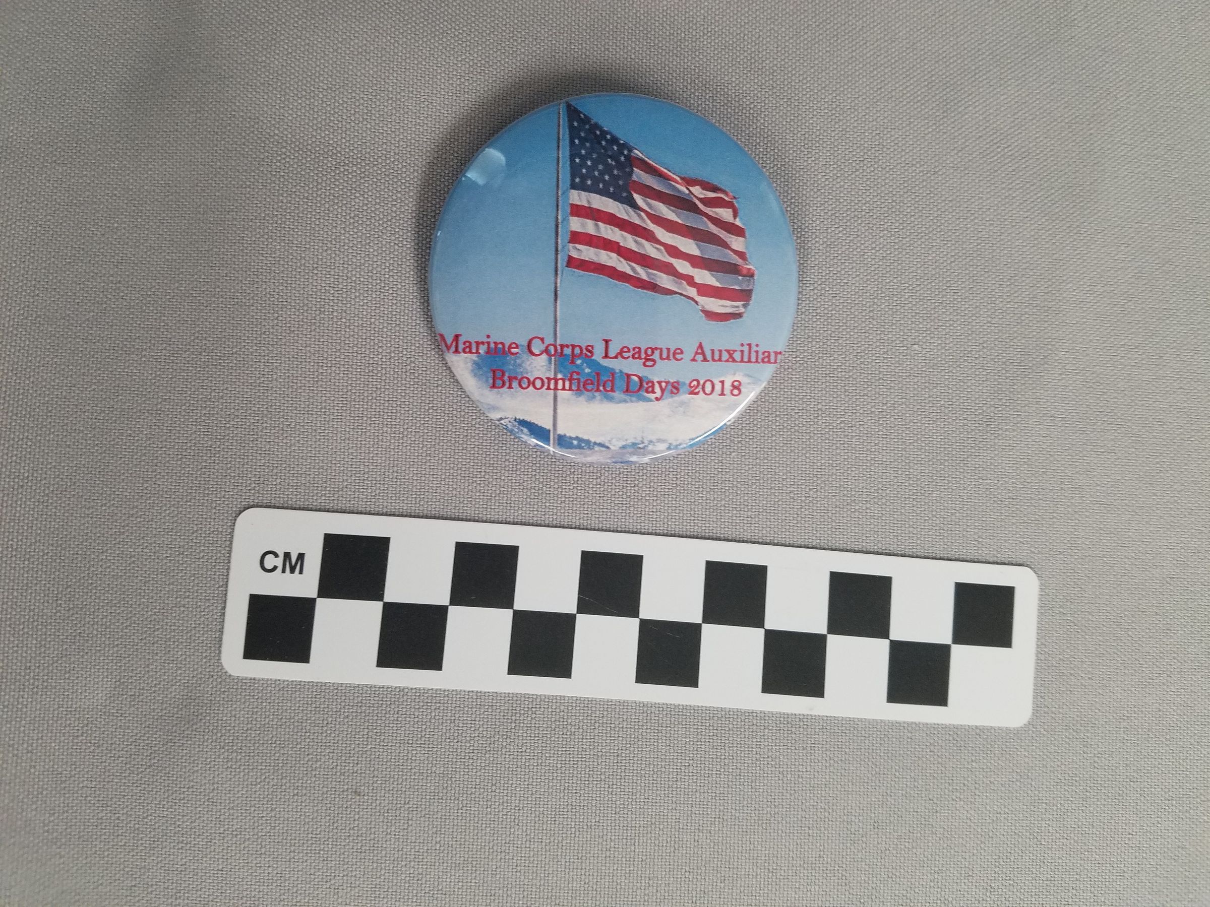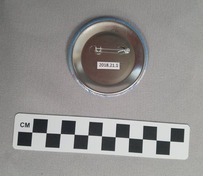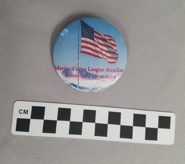 Tom Peyton, Broomfield Depot Museum Volunteer was running the booth for the BDMF at Broomfield Days 2018. The booth next to him was giving away these buttons as promotional material.