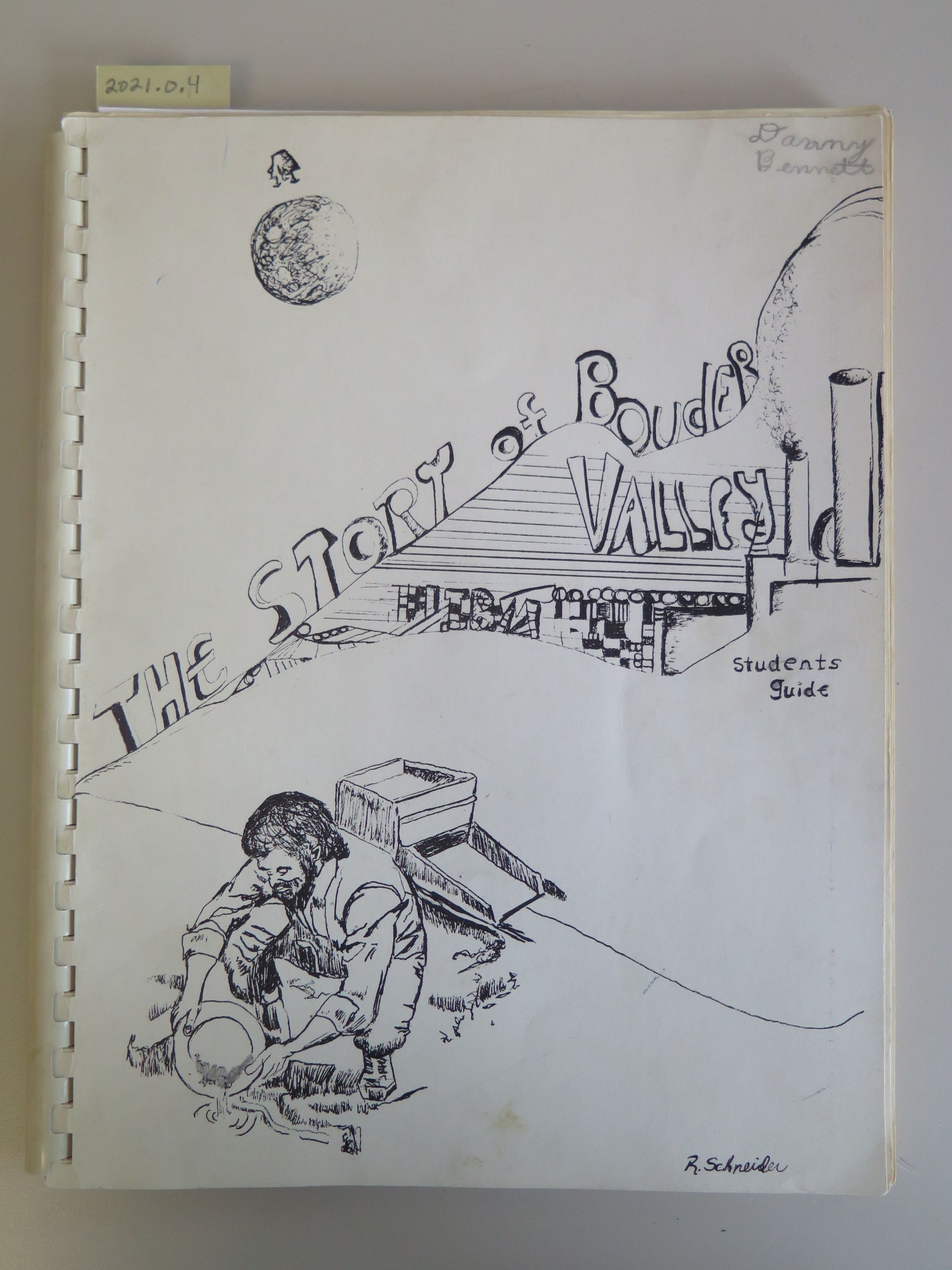 The Story of Boulder Valley. Book bound by plastic ring spine. Reprinted in 1969. Authored by R. Schneider. Owned by Danny Bennett, a student at Kohl Elementary. Used as Colorado History Curriculum for Boulder Valley Public School District Re-2.