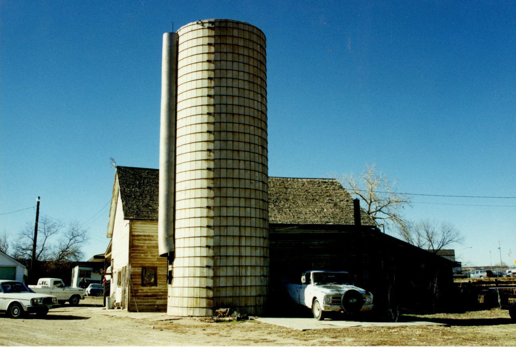 A picture of the grain silo on the Brunner property with a building and white truck beside it, taken 1998-01-29.Photograph Details